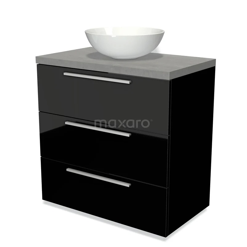Modulo Plato Badmöbel mit Aufsatzwaschbecken | 80 cm Hochglanz Schwarz Flach front Hellgrauer Beton blatt 3 Schubladen
