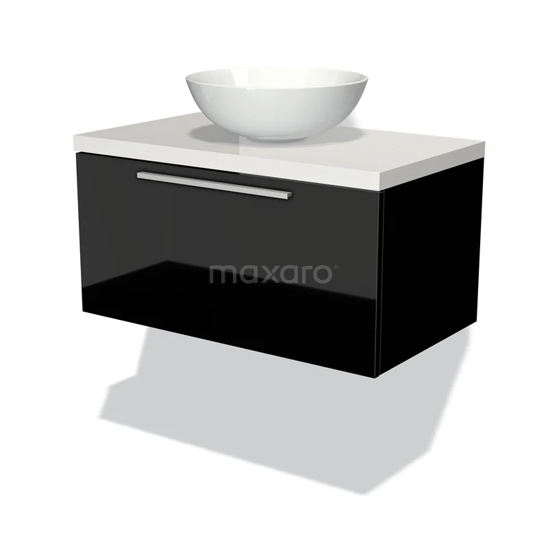 Modulo Plato Badmöbel mit Aufsatzwaschbecken | 80 cm Hochglanz Schwarz Flach front Hochglanz Weiß blatt 1 Schublade