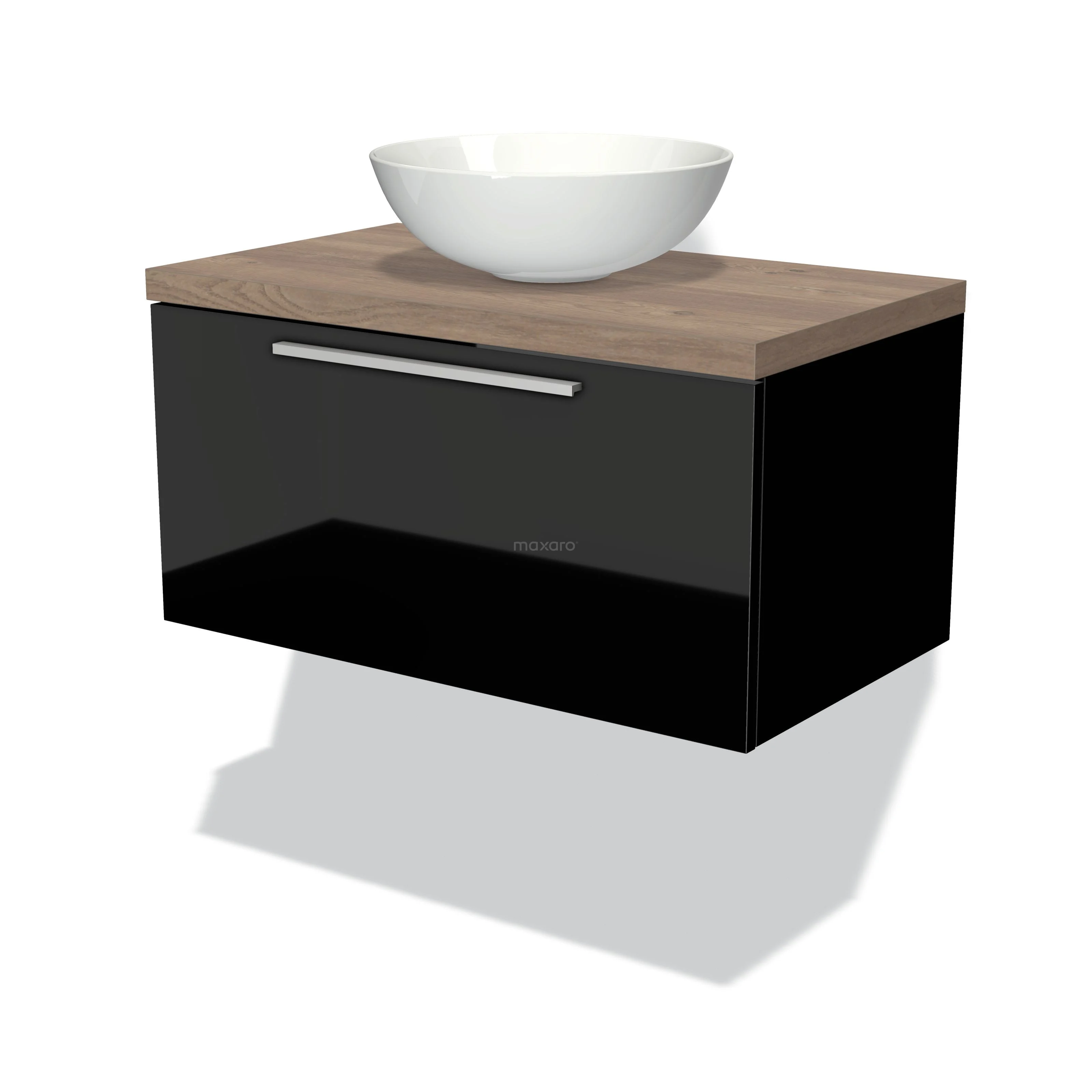 Modulo Plato Badmöbel mit Aufsatzwaschbecken | 80 cm Hochglanz Schwarz Flach front Mittelbraune Eiche blatt 1 Schublade