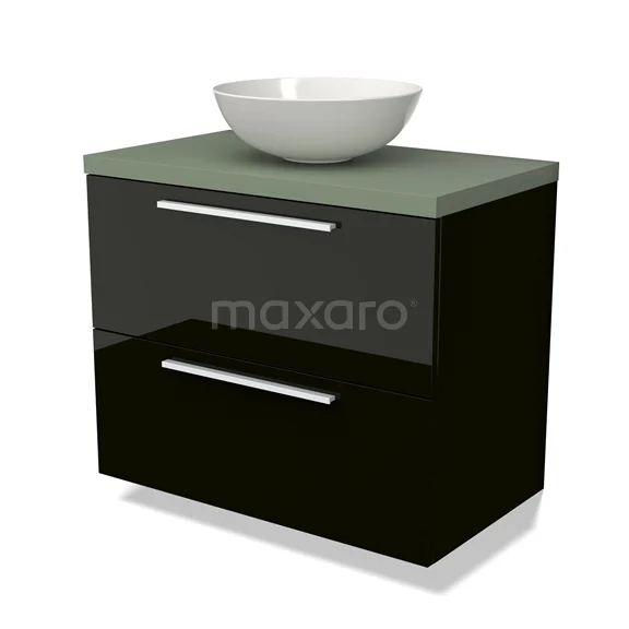 Modulo Plato Badmöbel mit Aufsatzwaschbecken | 80 cm Hochglanz Schwarz Flach front Salbeigrün blatt 2 übereinanderliegende Schubladen
