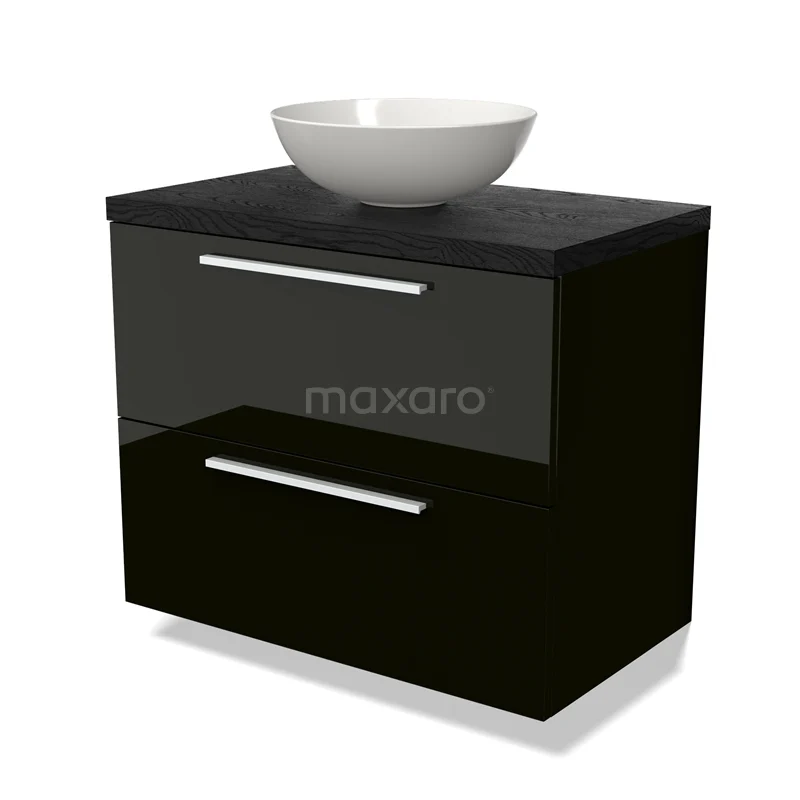 Modulo Plato Badmöbel mit Aufsatzwaschbecken | 80 cm Hochglanz Schwarz Flach front Schwarze Eiche blatt 2 übereinanderliegende Schubladen