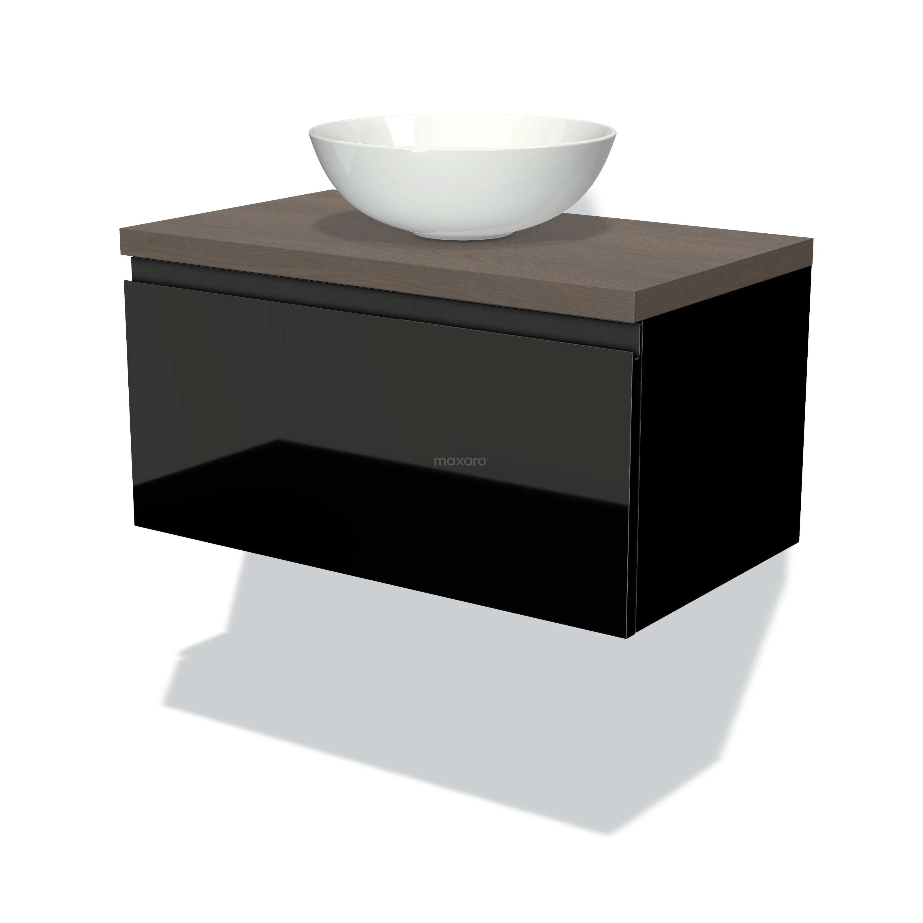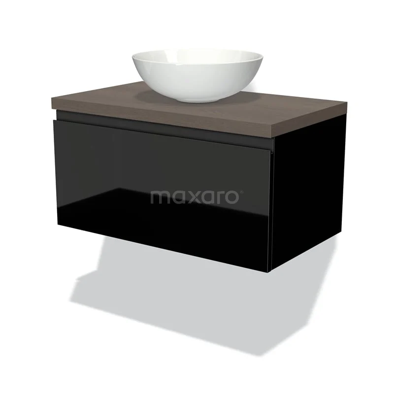 Modulo Plato Badmöbel mit Aufsatzwaschbecken | 80 cm Hochglanz Schwarz Grifflos front Dunkelbraune Eiche blatt 1 Schublade