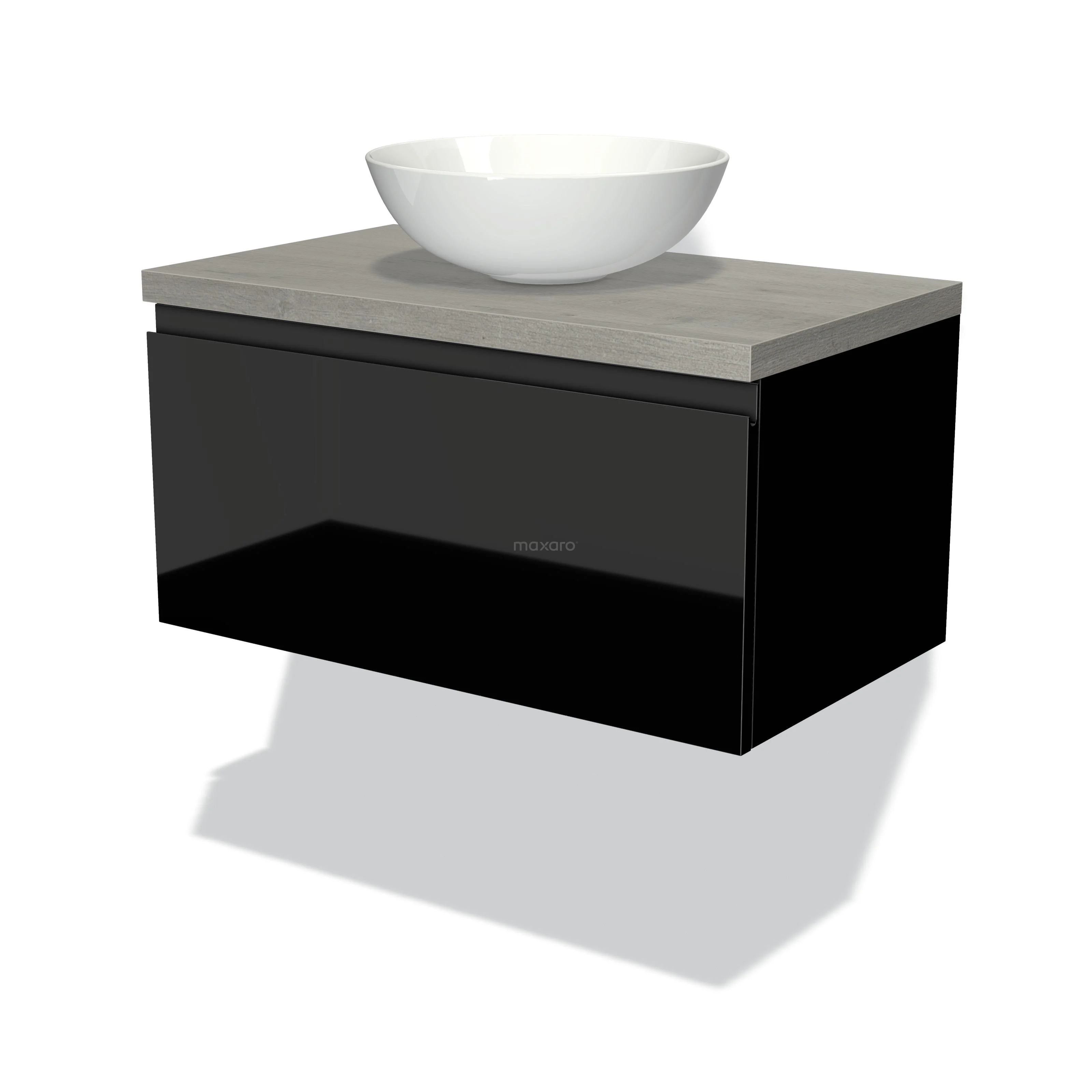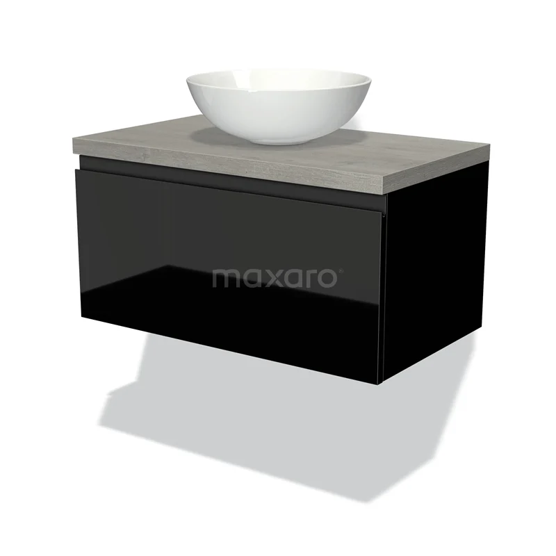 Modulo Plato Badmöbel mit Aufsatzwaschbecken | 80 cm Hochglanz Schwarz Grifflos front Graue Eiche blatt 1 Schublade