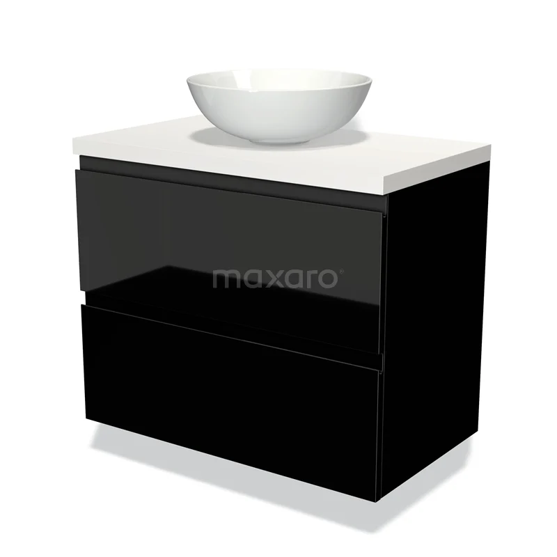 Modulo Plato Badmöbel mit Aufsatzwaschbecken | 80 cm Hochglanz Schwarz Grifflos front Matt Weiß blatt 2 übereinanderliegende Schubladen
