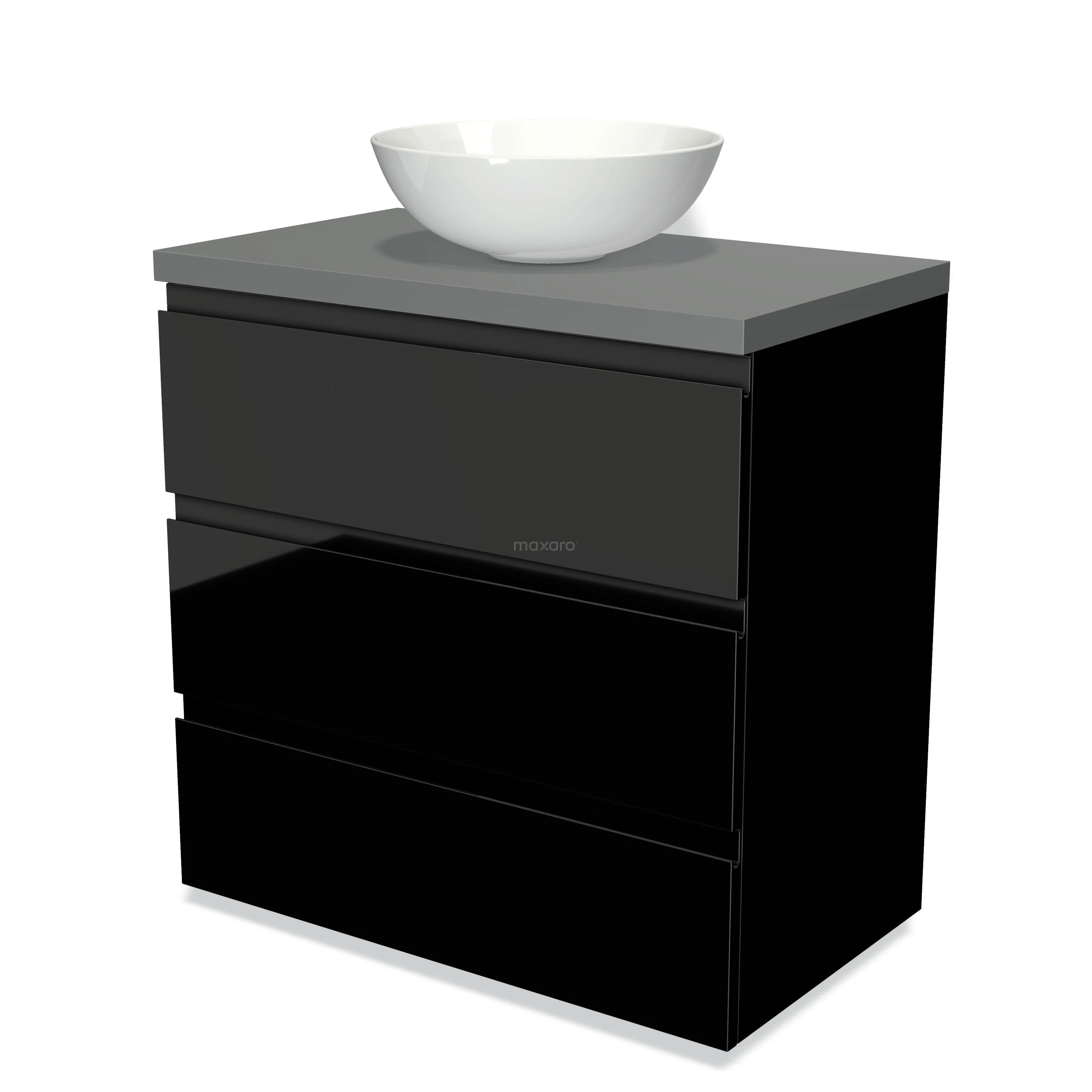 Modulo Plato Badmöbel mit Aufsatzwaschbecken | 80 cm Hochglanz Schwarz Grifflos front Mittelgrau blatt 3 Schubladen