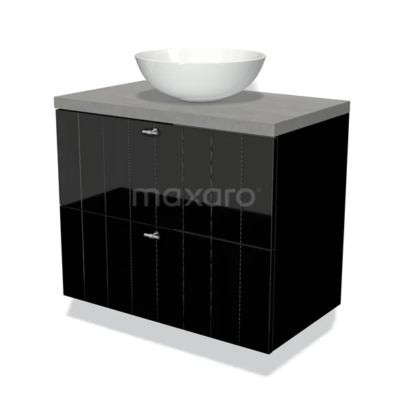 Modulo Plato Badmöbel mit Aufsatzwaschbecken | 80 cm Hochglanz Schwarz Lamelle front Hellgrauer Beton blatt 2 übereinanderliegende Schubladen