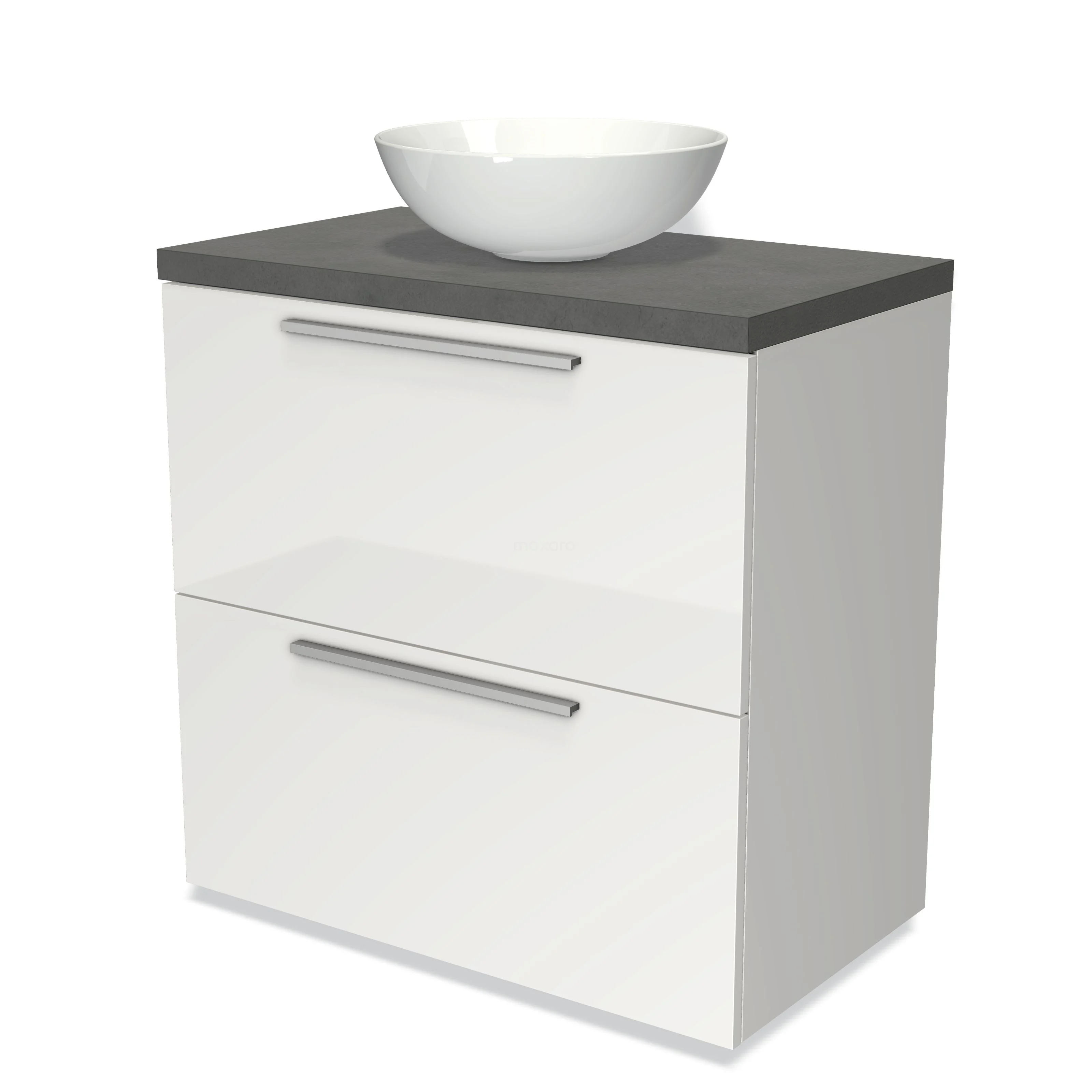 Modulo Plato Badmöbel mit Aufsatzwaschbecken | 80 cm Hochglanz Weiß Flach front Dunkelgrauer Beton blatt 2 hohe Schubladen übereinanderliegend
