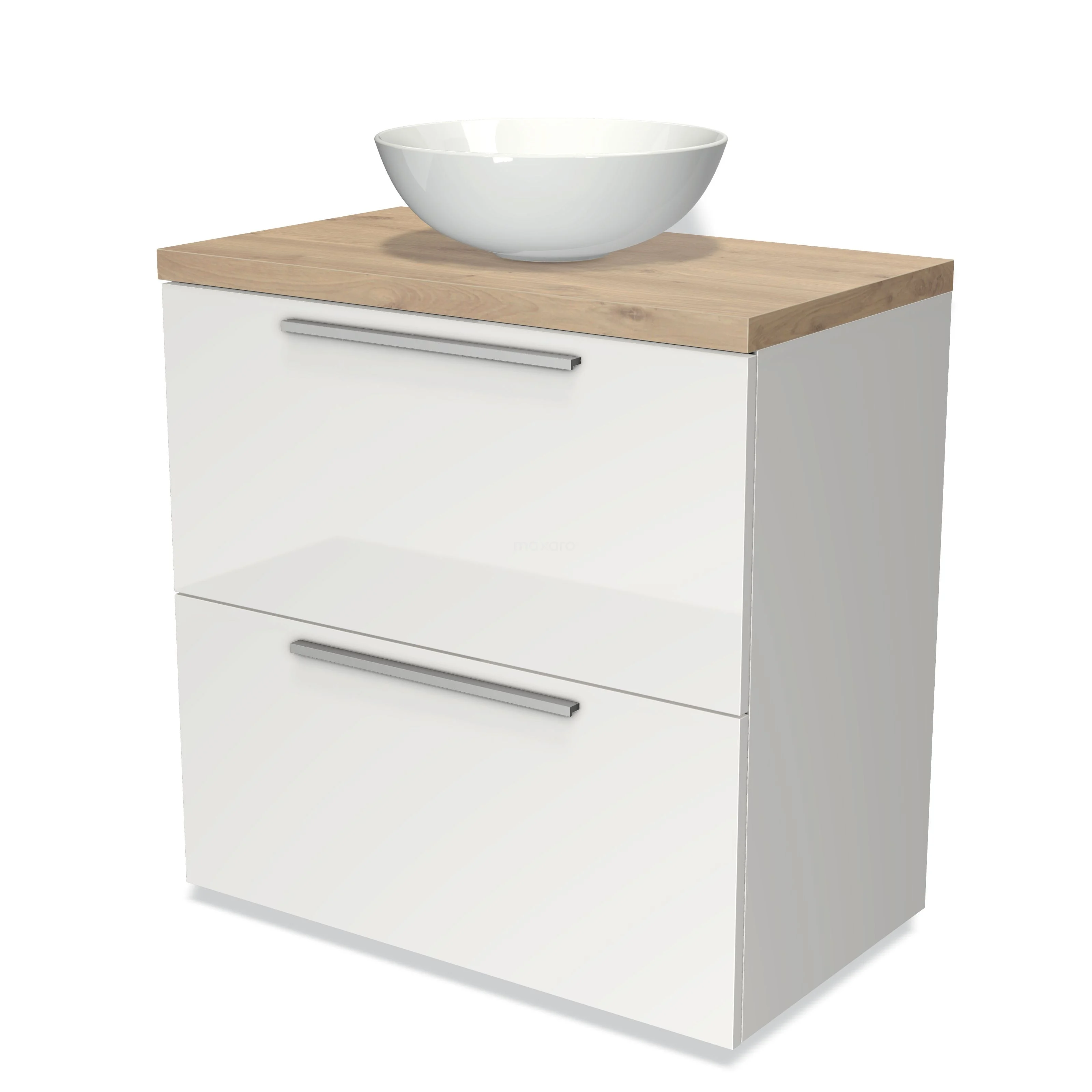 Modulo Plato Badmöbel mit Aufsatzwaschbecken | 80 cm Hochglanz Weiß Flach front Hellbraune Eiche blatt 2 hohe Schubladen übereinanderliegend