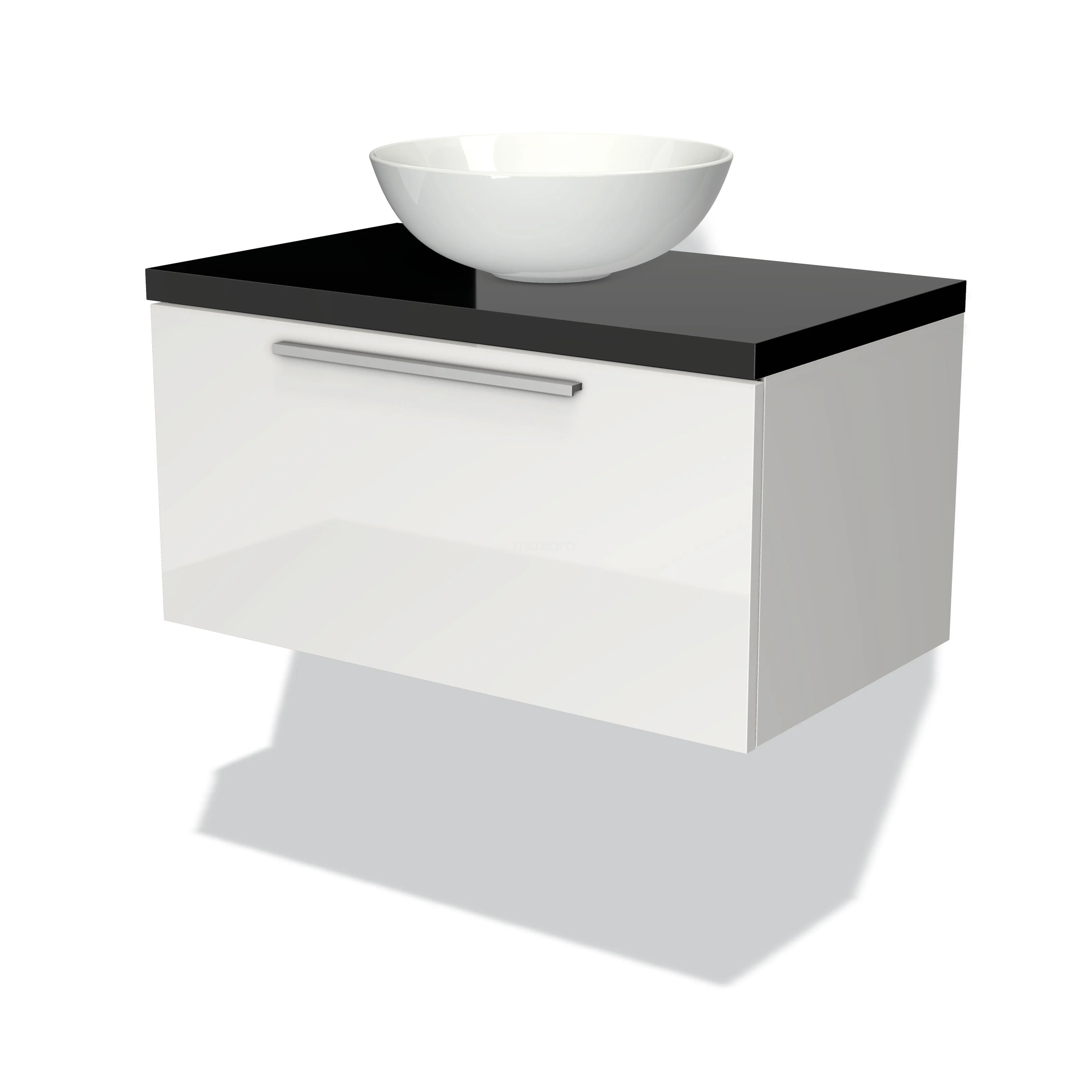 Modulo Plato Badmöbel mit Aufsatzwaschbecken | 80 cm Hochglanz Weiß Flach front Hochglanz Schwarz blatt 1 Schublade