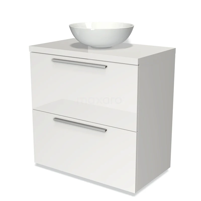 Modulo Plato Badmöbel mit Aufsatzwaschbecken | 80 cm Hochglanz Weiß Flach front Hochglanz Weiß blatt 2 hohe Schubladen übereinanderliegend