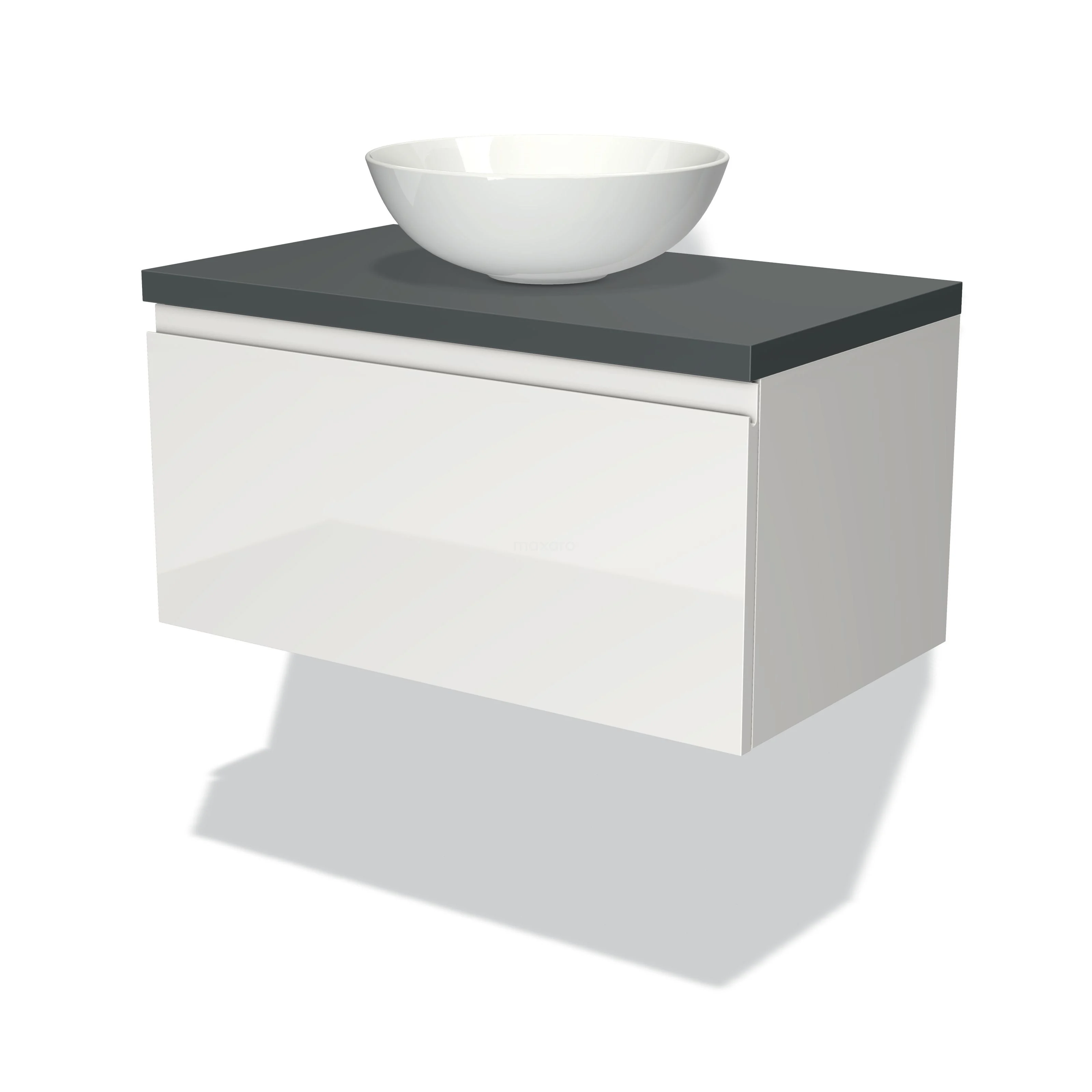 Modulo Plato Badmöbel mit Aufsatzwaschbecken | 80 cm Hochglanz Weiß Grifflos front Dunkelgrau blatt 1 Schublade