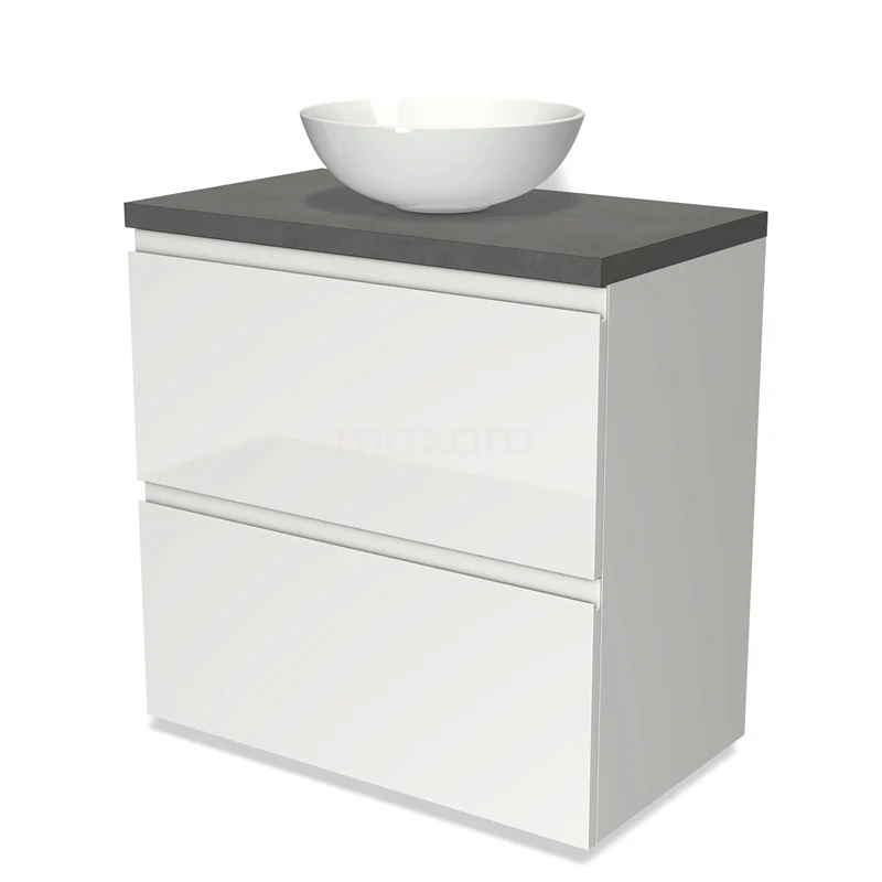 Modulo Plato Badmöbel mit Aufsatzwaschbecken | 80 cm Hochglanz Weiß Grifflos front Dunkelgrauer Beton blatt 2 hohe Schubladen übereinanderliegend