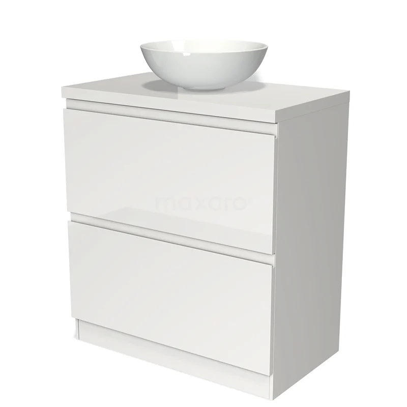 Modulo Plato Badmöbel mit Aufsatzwaschbecken | 80 cm Hochglanz Weiß Grifflos front Hochglanz Weiß blatt 2 hohe Schubladen übereinanderliegend