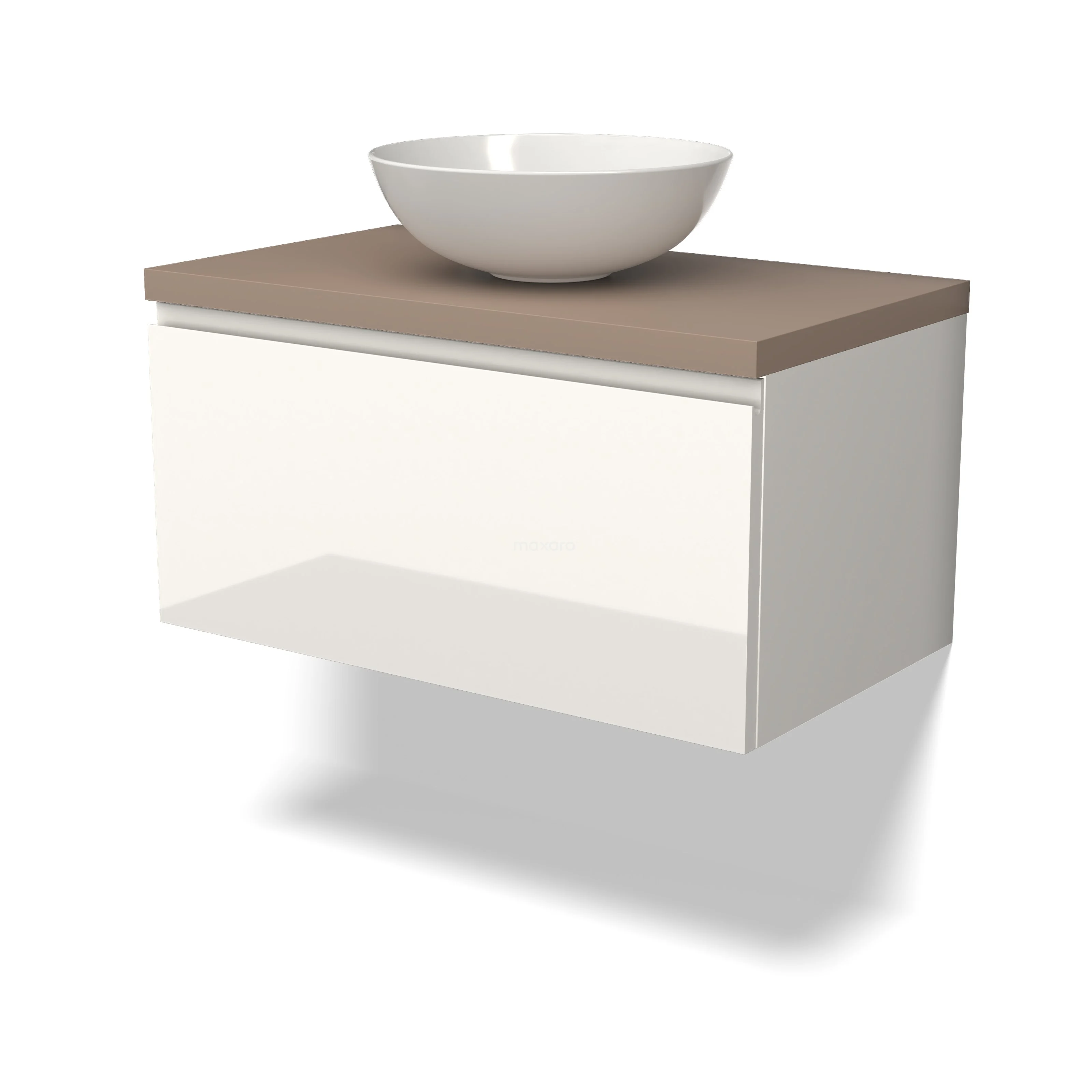 Modulo Plato Badmöbel mit Aufsatzwaschbecken | 80 cm Hochglanz Weiß Grifflos front Taupe blatt 1 Schublade