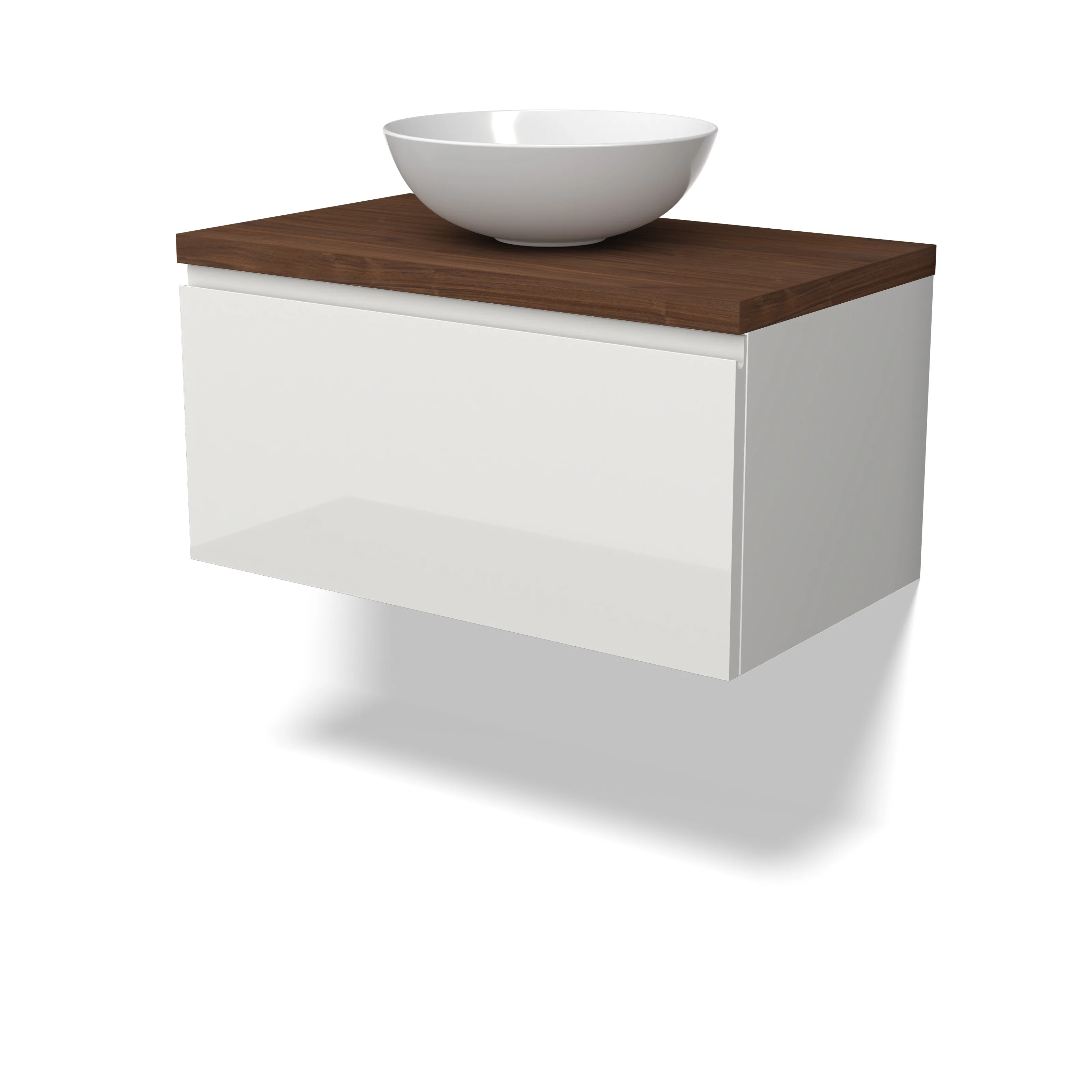 Modulo Plato Badmöbel mit Aufsatzwaschbecken | 80 cm Hochglanz Weiß Grifflos front Walnuss blatt 1 Schublade