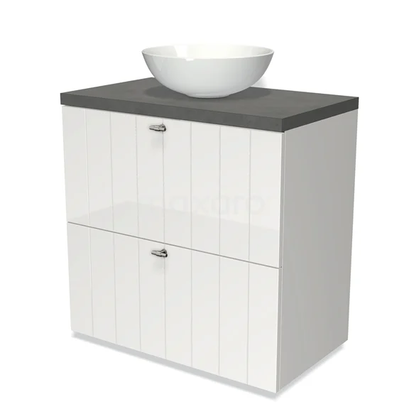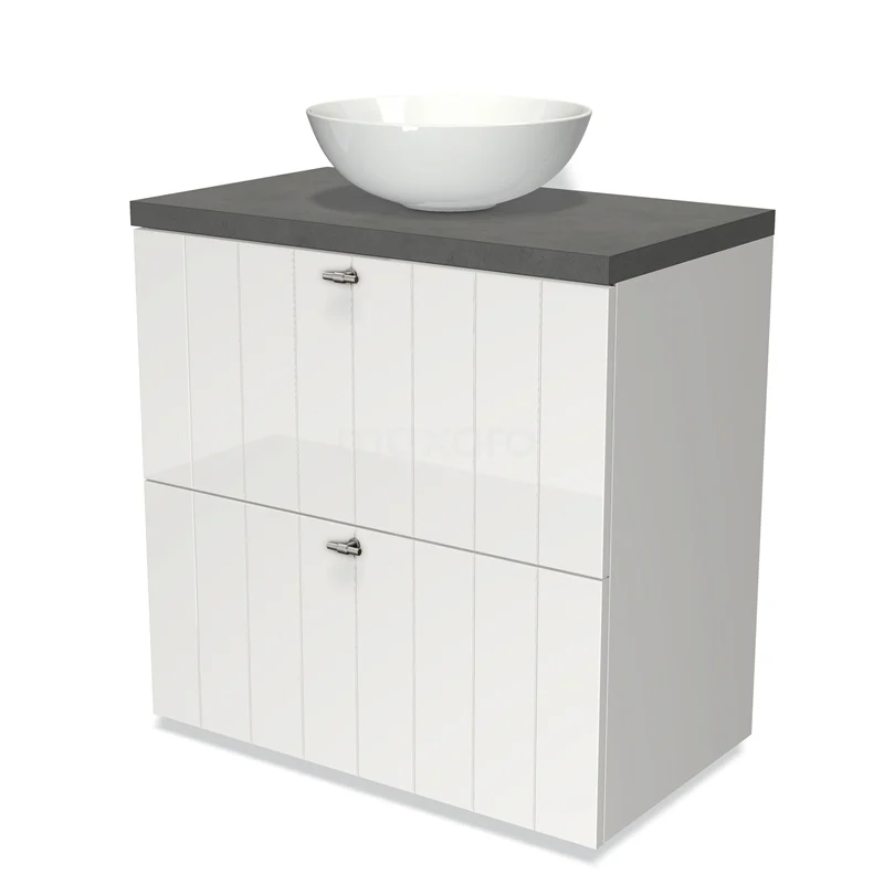 Modulo Plato Badmöbel mit Aufsatzwaschbecken | 80 cm Hochglanz Weiß Lamelle front Dunkelgrauer Beton blatt 2 hohe Schubladen übereinanderliegend