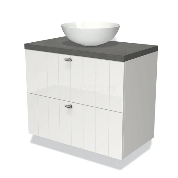 Modulo Plato Badmöbel mit Aufsatzwaschbecken | 80 cm Hochglanz Weiß Lamelle front Dunkelgrauer Beton blatt 2 übereinanderliegende Schubladen