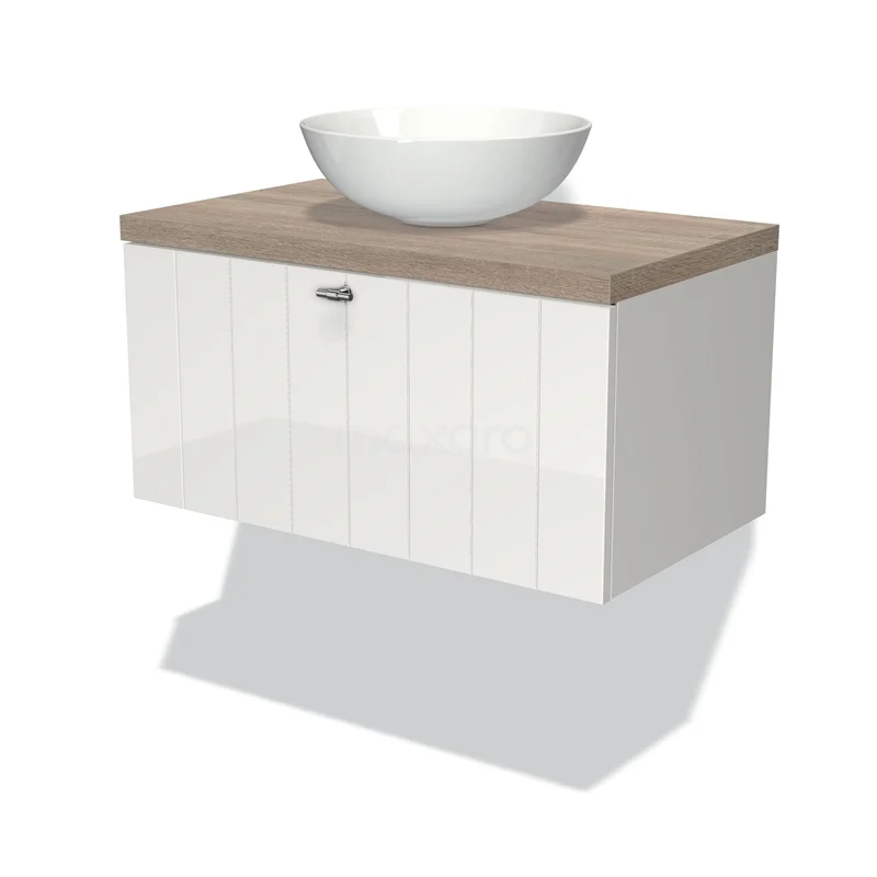 Modulo Plato Badmöbel mit Aufsatzwaschbecken | 80 cm Hochglanz Weiß Lamelle front Eiche blatt 1 Schublade