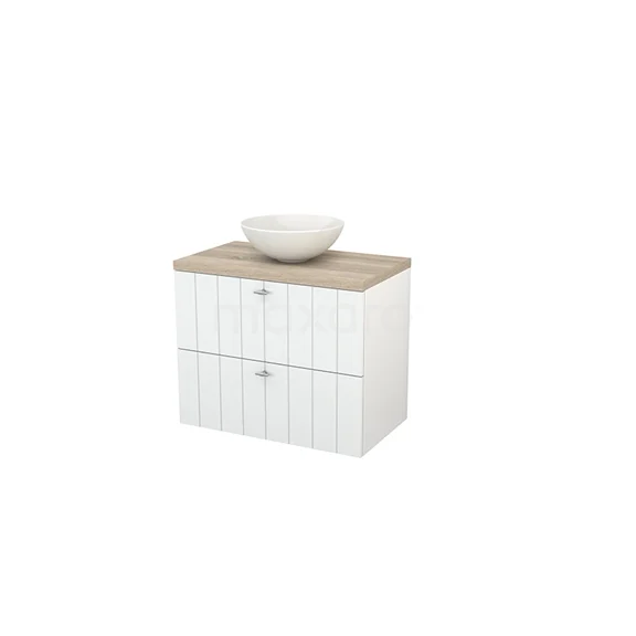 Modulo+ Plato Badmöbel mit Aufsatzwaschbecken | 80 cm Hochglanz Weiß Lamelle front Eiche blatt 2 übereinanderliegende Schubladen
