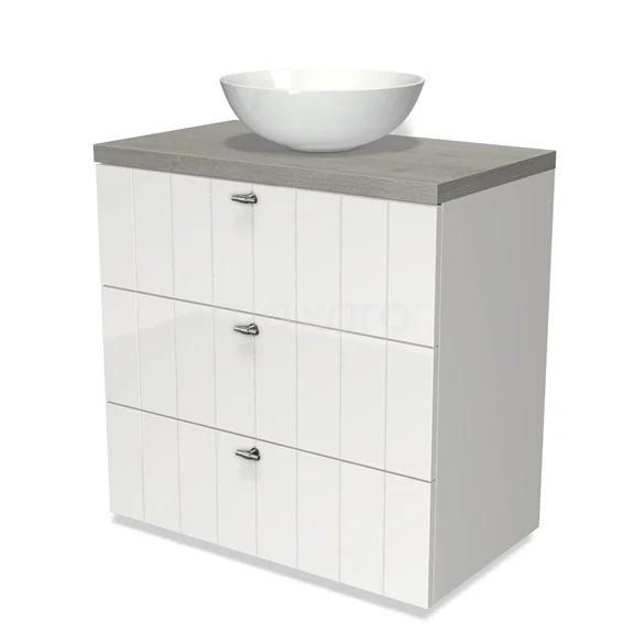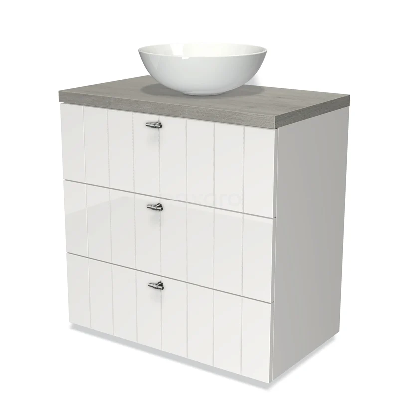 Modulo Plato Badmöbel mit Aufsatzwaschbecken | 80 cm Hochglanz Weiß Lamelle front Graue Eiche blatt 3 Schubladen