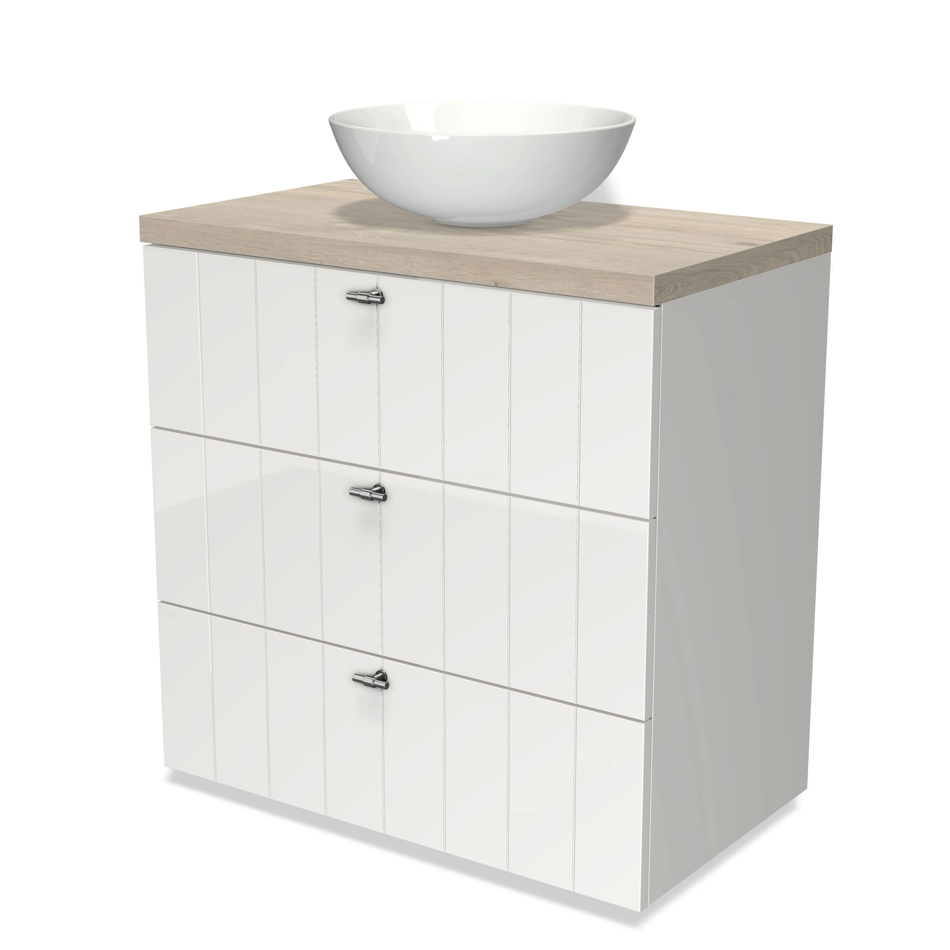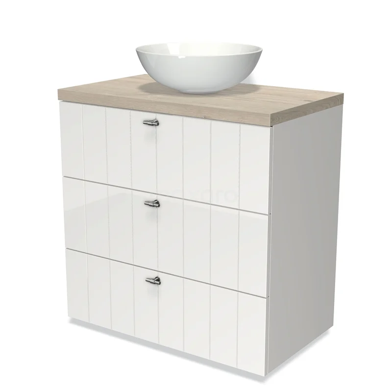 Modulo Plato Badmöbel mit Aufsatzwaschbecken | 80 cm Hochglanz Weiß Lamelle front Hellgraue Eiche blatt 3 Schubladen