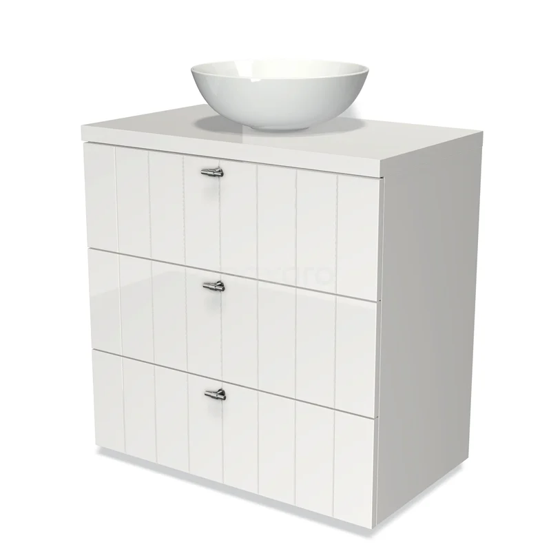 Modulo Plato Badmöbel mit Aufsatzwaschbecken | 80 cm Hochglanz Weiß Lamelle front Hochglanz Weiß blatt 3 Schubladen