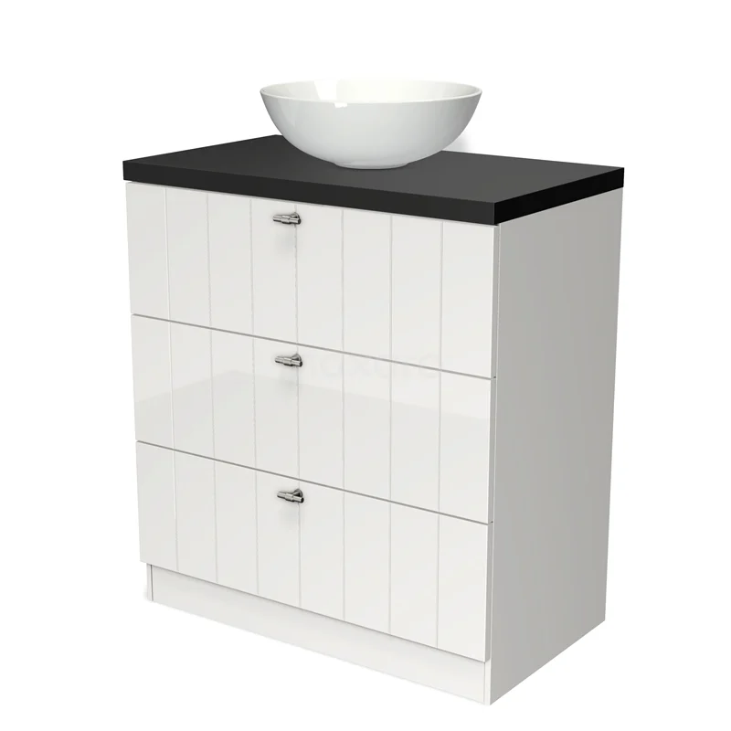 Modulo Plato Badmöbel mit Aufsatzwaschbecken | 80 cm Hochglanz Weiß Lamelle front Matt Schwarz blatt 3 stehende Schubladen
