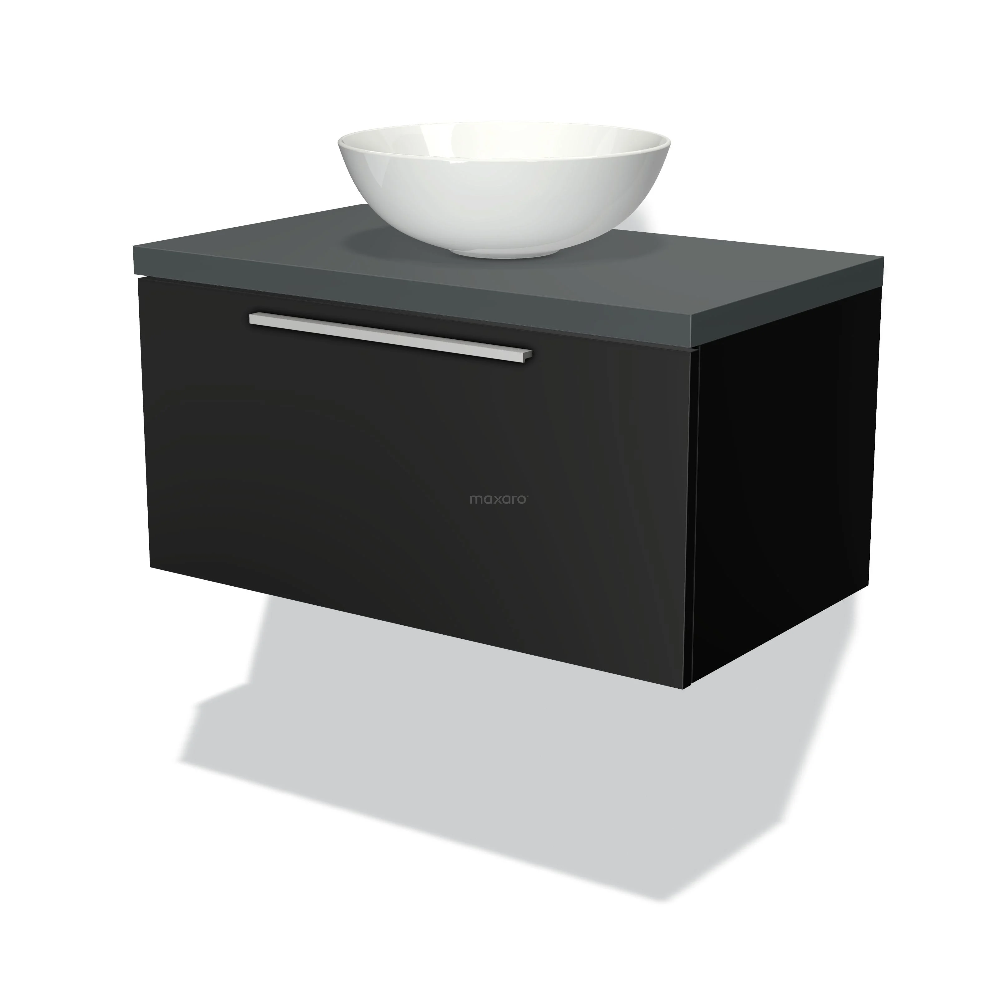 Modulo Plato Badmöbel mit Aufsatzwaschbecken | 80 cm Matt Schwarz Flach front Dunkelgrau blatt 1 Schublade