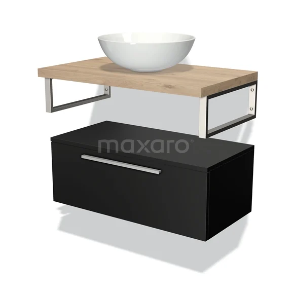 Modulo Plato Badmöbel mit Aufsatzwaschbecken | 80 cm Matt Schwarz Flach front Hellbraune Eiche blatt Tief hängend