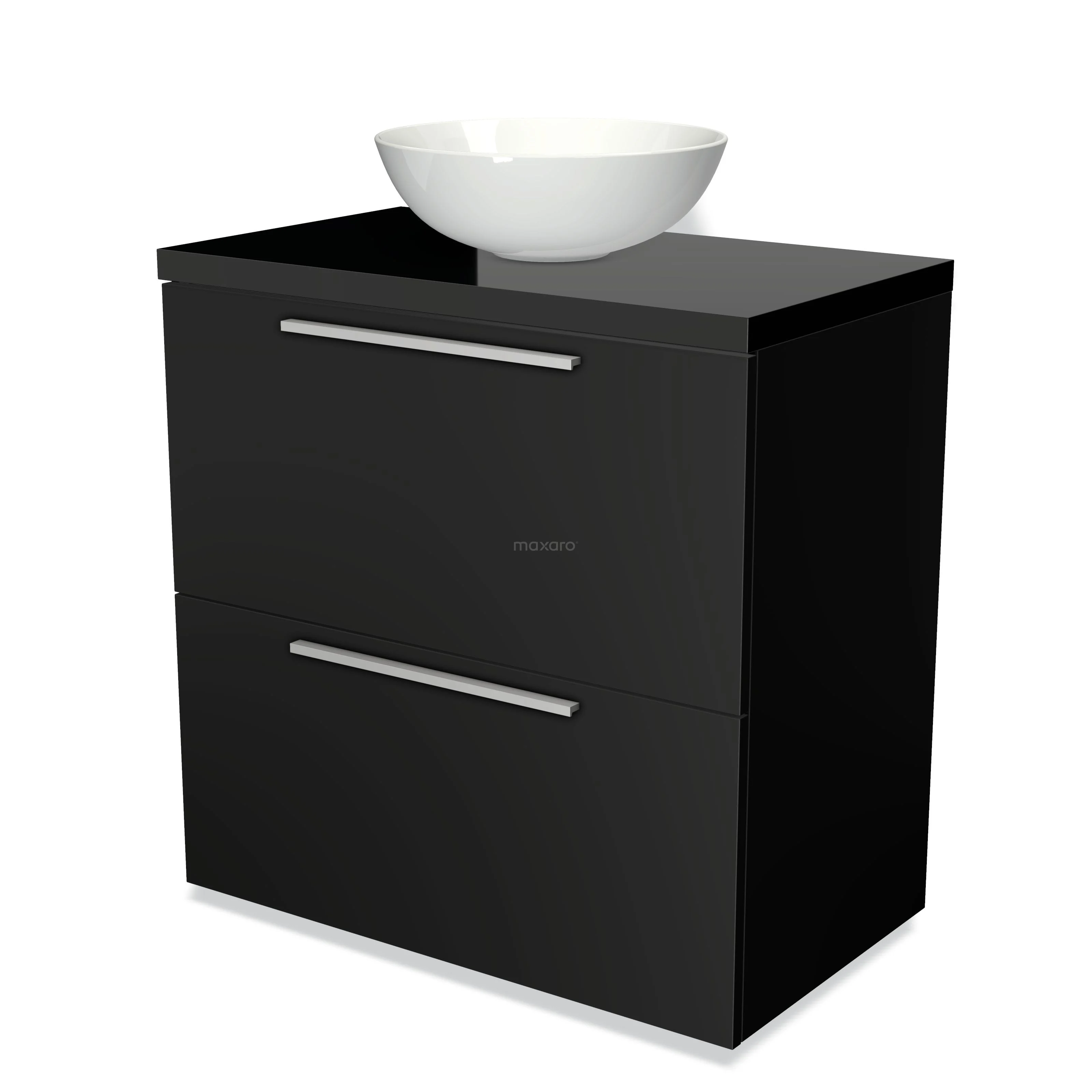 Modulo Plato Badmöbel mit Aufsatzwaschbecken | 80 cm Matt Schwarz Flach front Hochglanz Schwarz blatt 2 hohe Schubladen übereinanderliegend