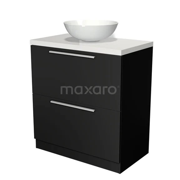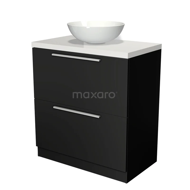 Modulo Plato Badmöbel mit Aufsatzwaschbecken | 80 cm Matt Schwarz Flach front Hochglanz Weiß blatt 2 hohe Schubladen übereinanderliegend