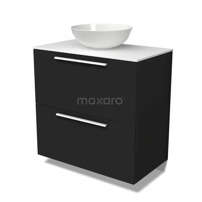 Modulo Plato Badmöbel mit Aufsatzwaschbecken | 80 cm Matt Schwarz Flach front Solid Surface blatt 2 hohe Schubladen übereinanderliegend