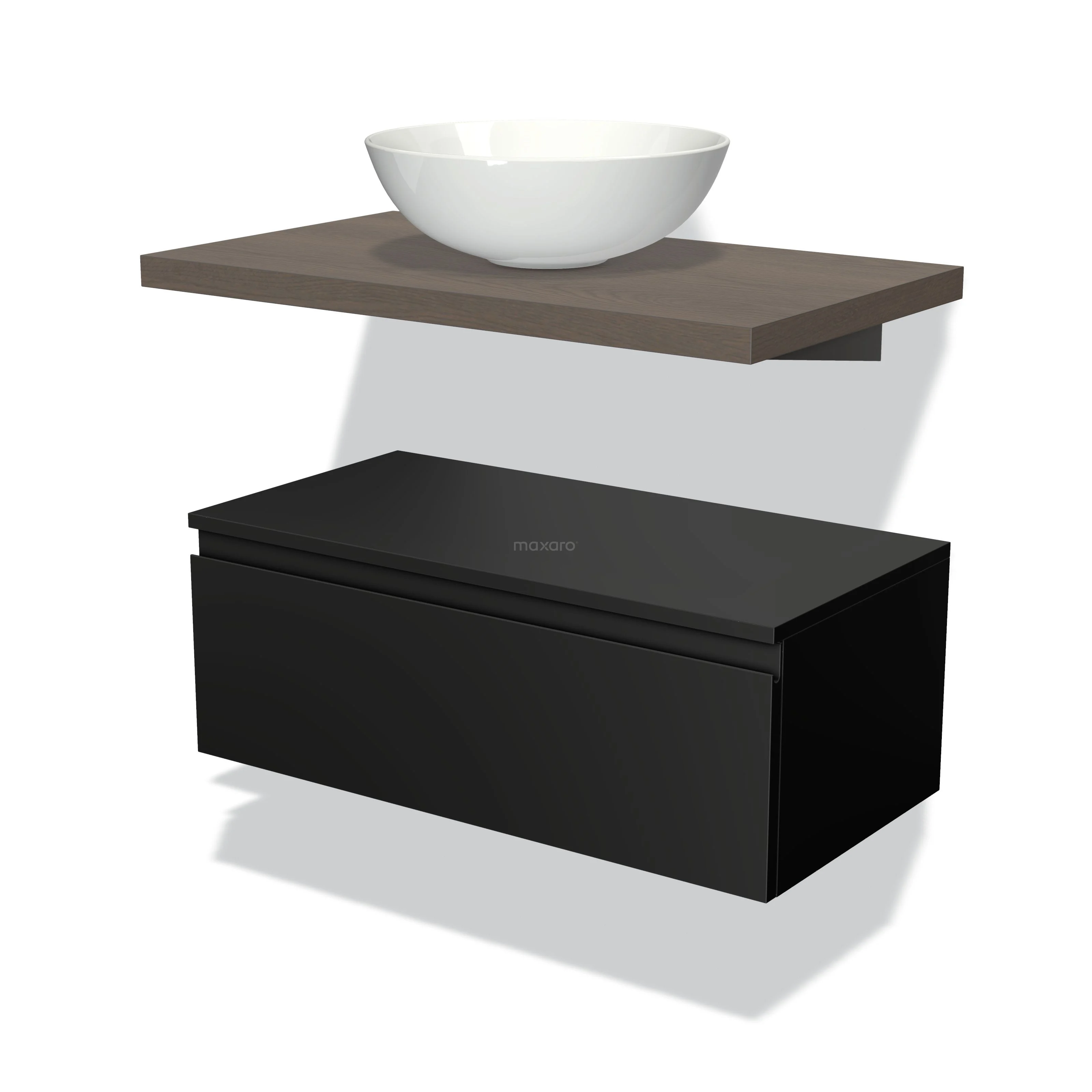 Modulo Plato Badmöbel mit Aufsatzwaschbecken | 80 cm Matt Schwarz Grifflos front Dunkelbraune Eiche blatt Tief hängend