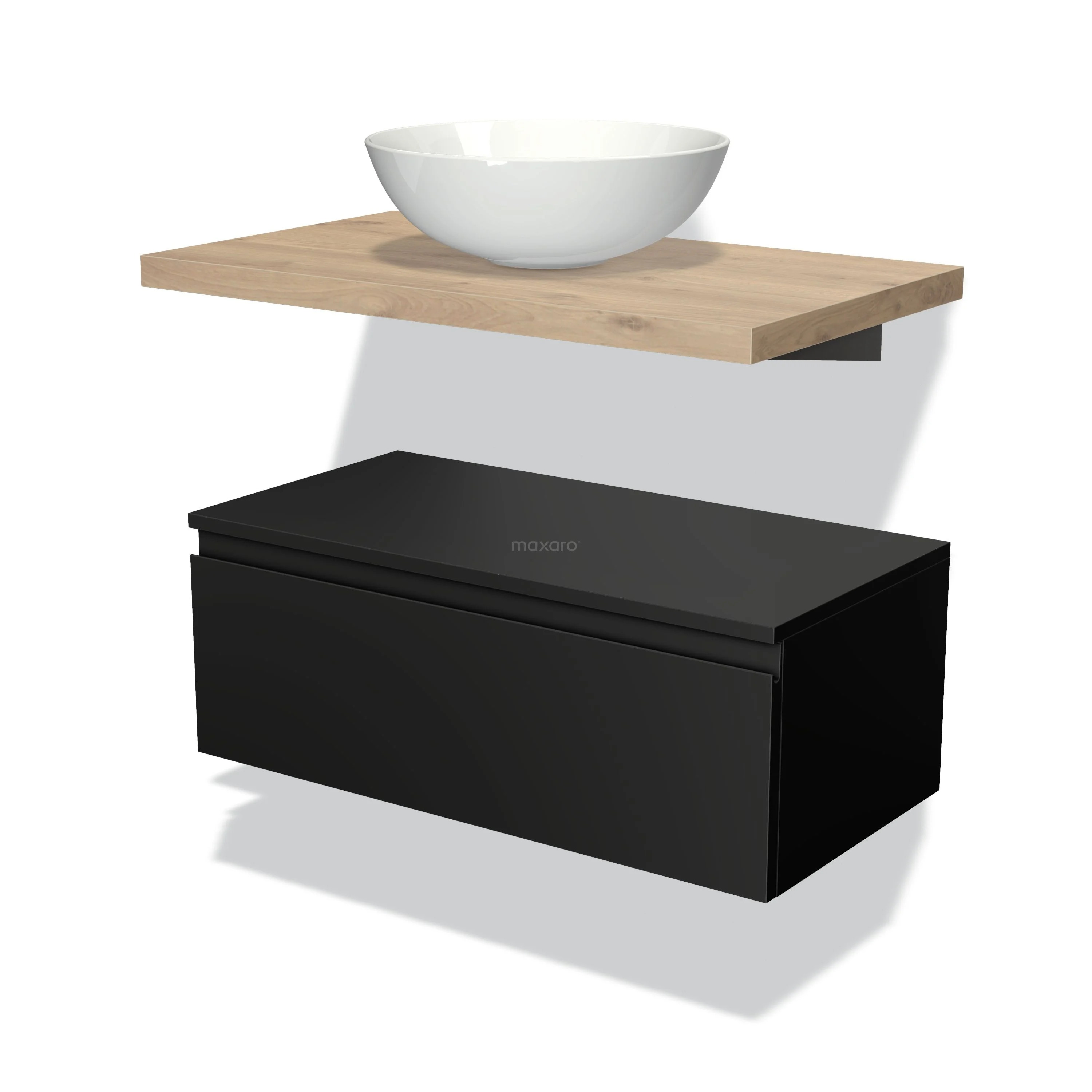 Modulo Plato Badmöbel mit Aufsatzwaschbecken | 80 cm Matt Schwarz Grifflos front Hellbraune Eiche blatt Tief hängend