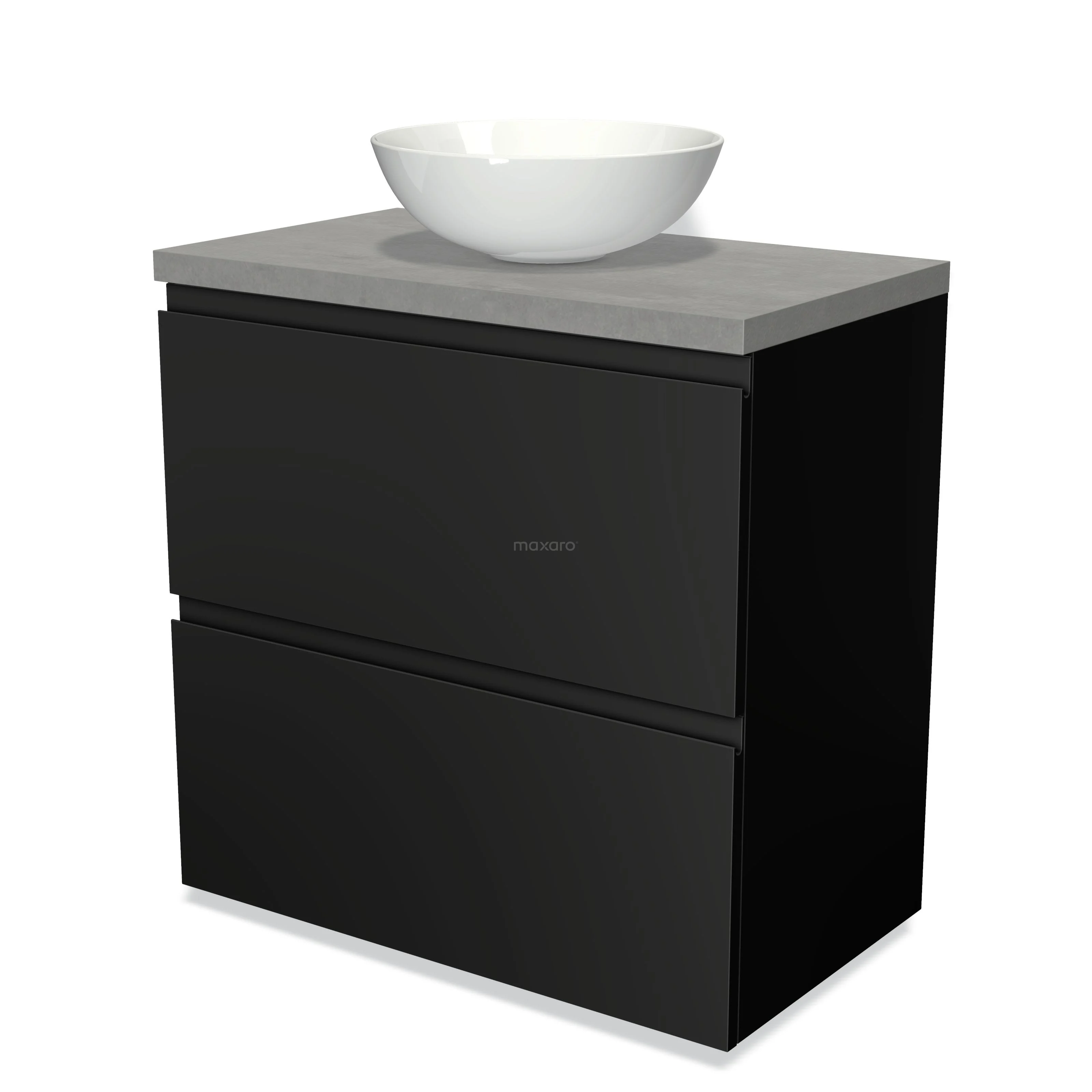 Modulo Plato Badmöbel mit Aufsatzwaschbecken | 80 cm Matt Schwarz Grifflos front Hellgrauer Beton blatt 2 hohe Schubladen übereinanderliegend