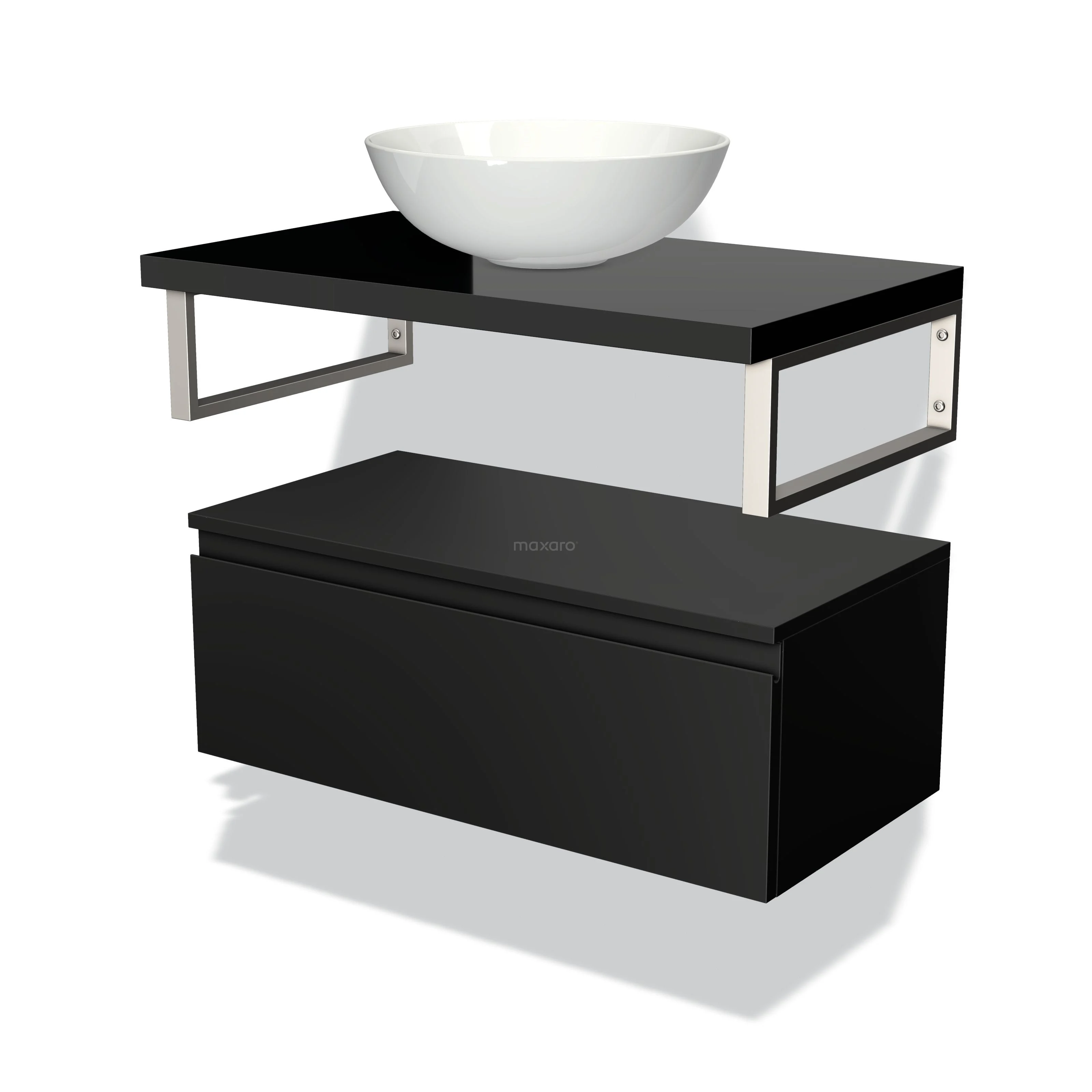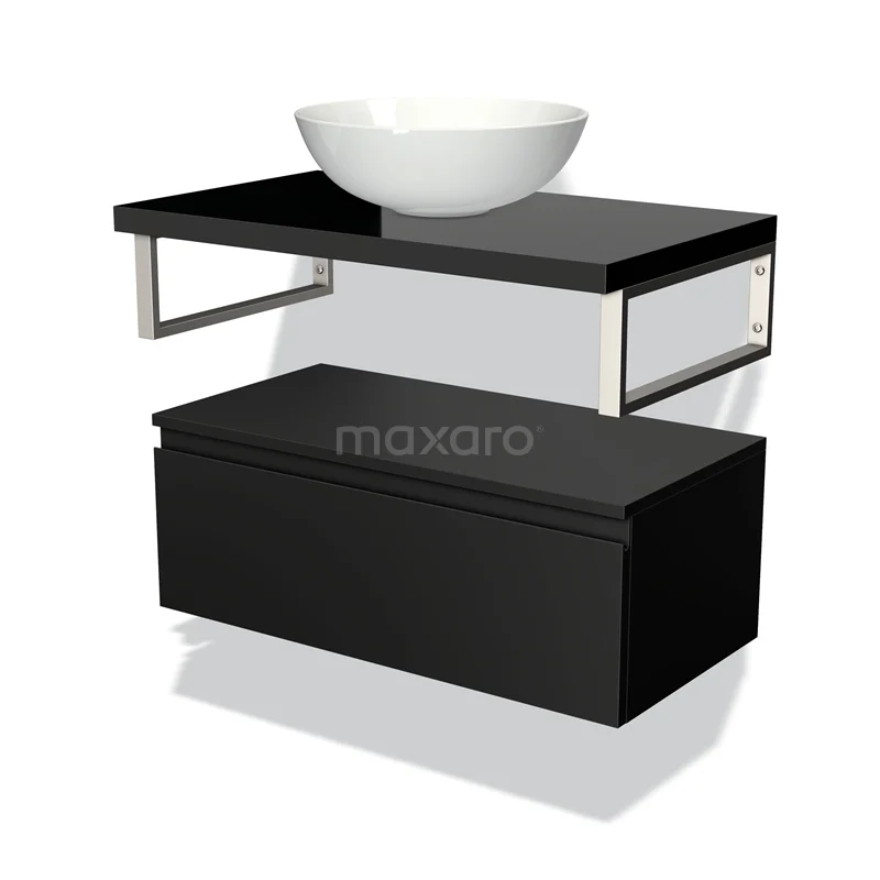 Modulo Plato Badmöbel mit Aufsatzwaschbecken | 80 cm Matt Schwarz Grifflos front Hochglanz Schwarz blatt Tief hängend