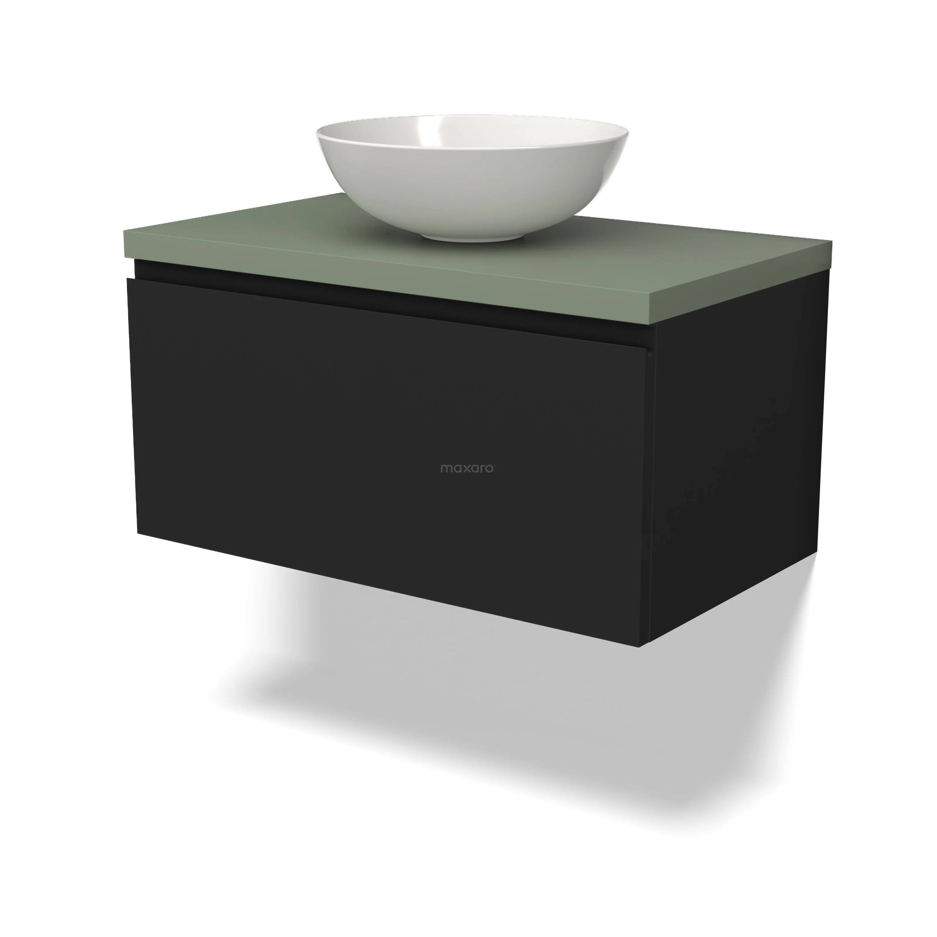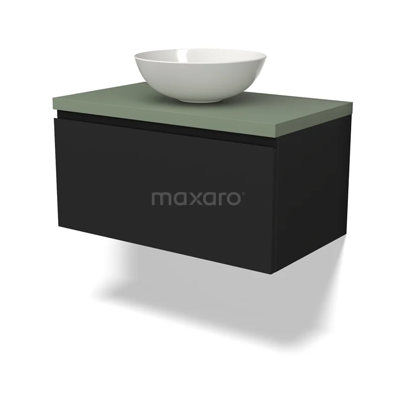 Modulo Plato Badmöbel mit Aufsatzwaschbecken | 80 cm Matt Schwarz Grifflos front Salbeigrün blatt 1 Schublade
