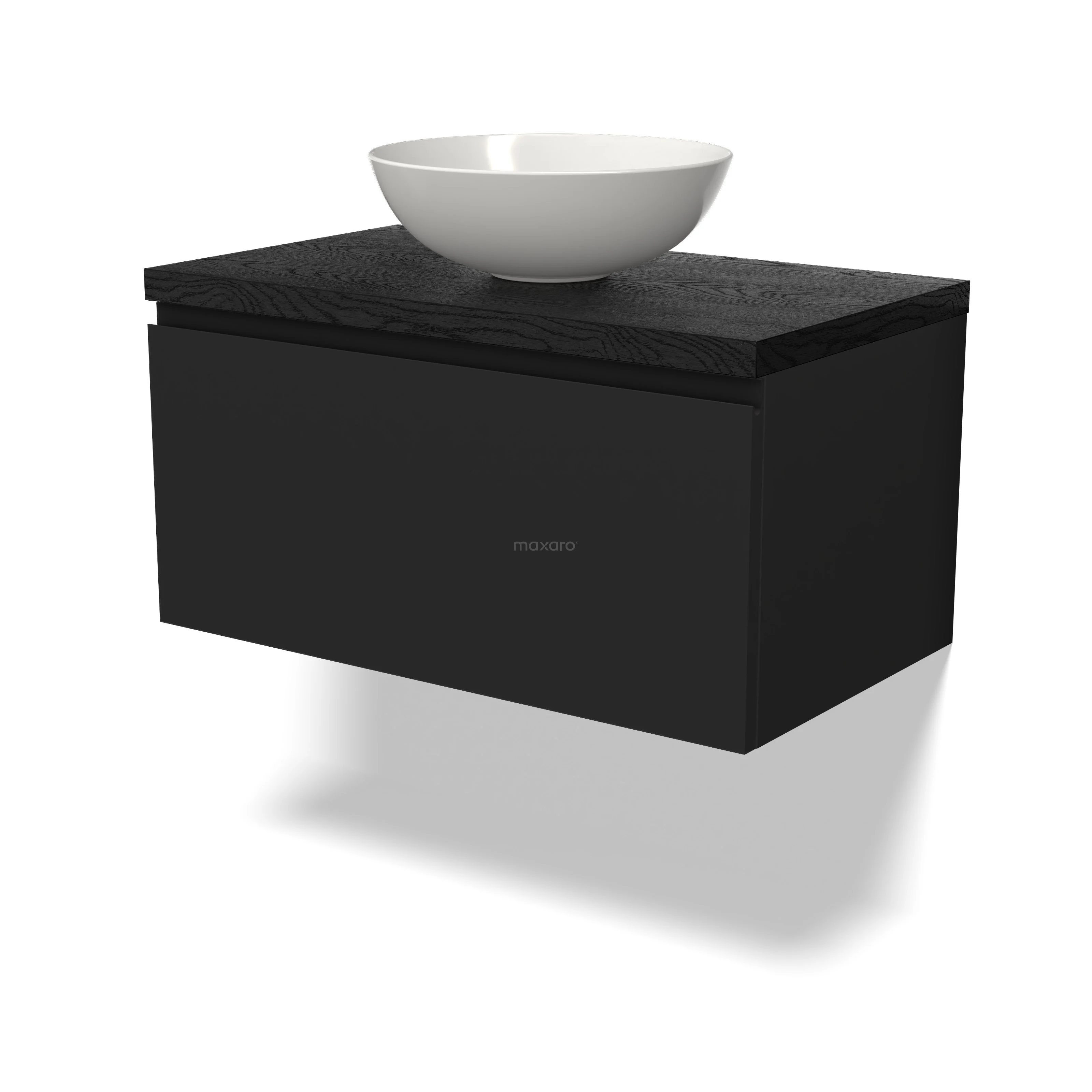 Modulo Plato Badmöbel mit Aufsatzwaschbecken | 80 cm Matt Schwarz Grifflos front Schwarze Eiche blatt 1 Schublade