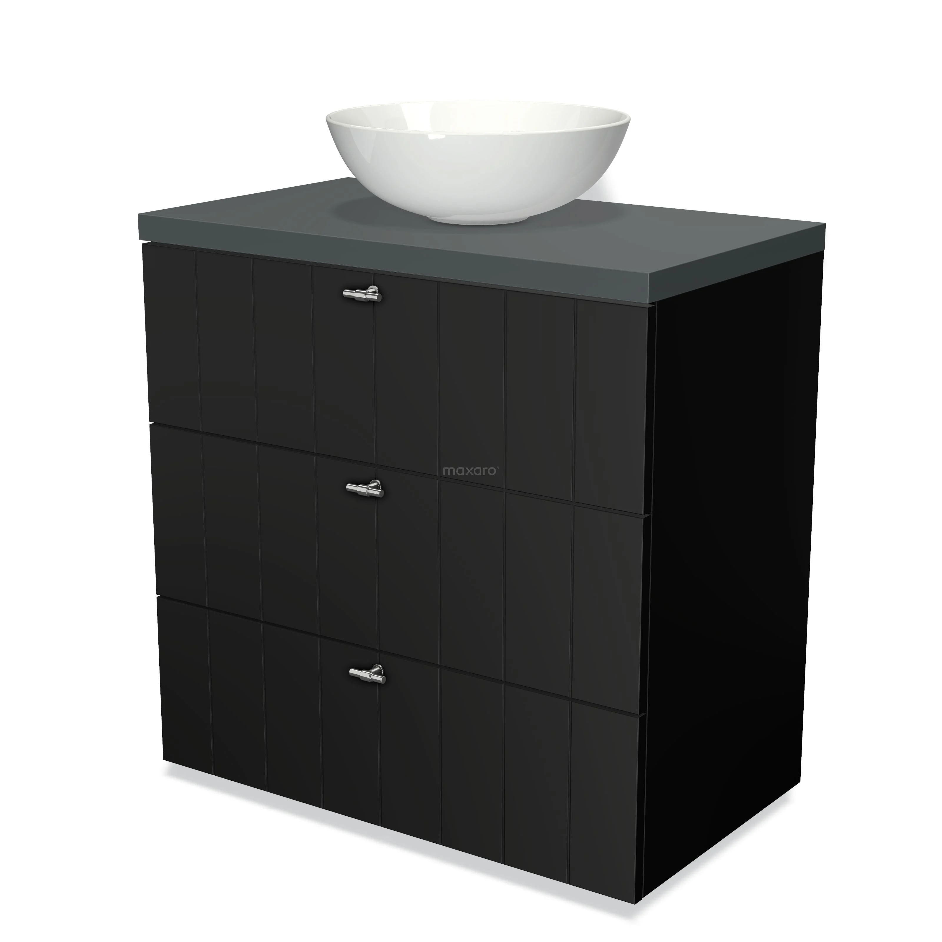 Modulo Plato Badmöbel mit Aufsatzwaschbecken | 80 cm Matt Schwarz Lamelle front Dunkelgrau blatt 3 Schubladen