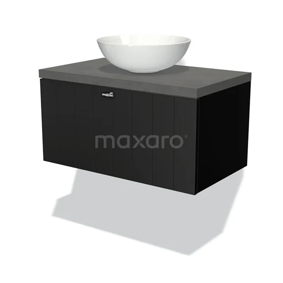 Modulo Plato Badmöbel mit Aufsatzwaschbecken | 80 cm Matt Schwarz Lamelle front Dunkelgrauer Beton blatt 1 Schublade