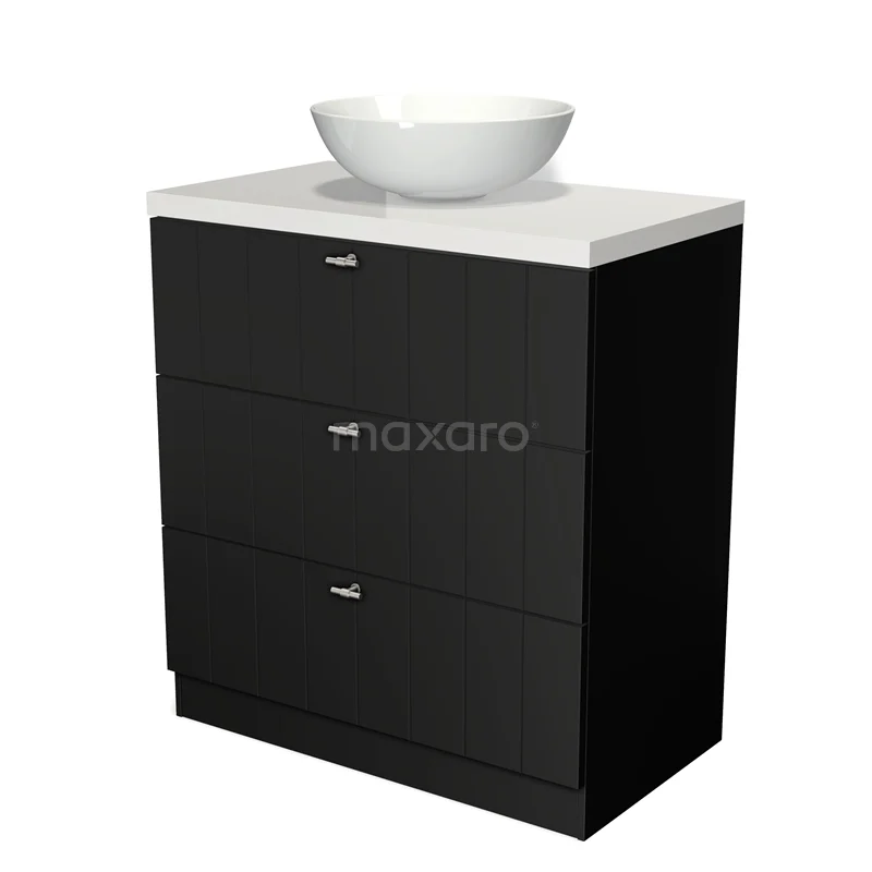 Modulo Plato Badmöbel mit Aufsatzwaschbecken | 80 cm Matt Schwarz Lamelle front Hochglanz Weiß blatt 3 stehende Schubladen
