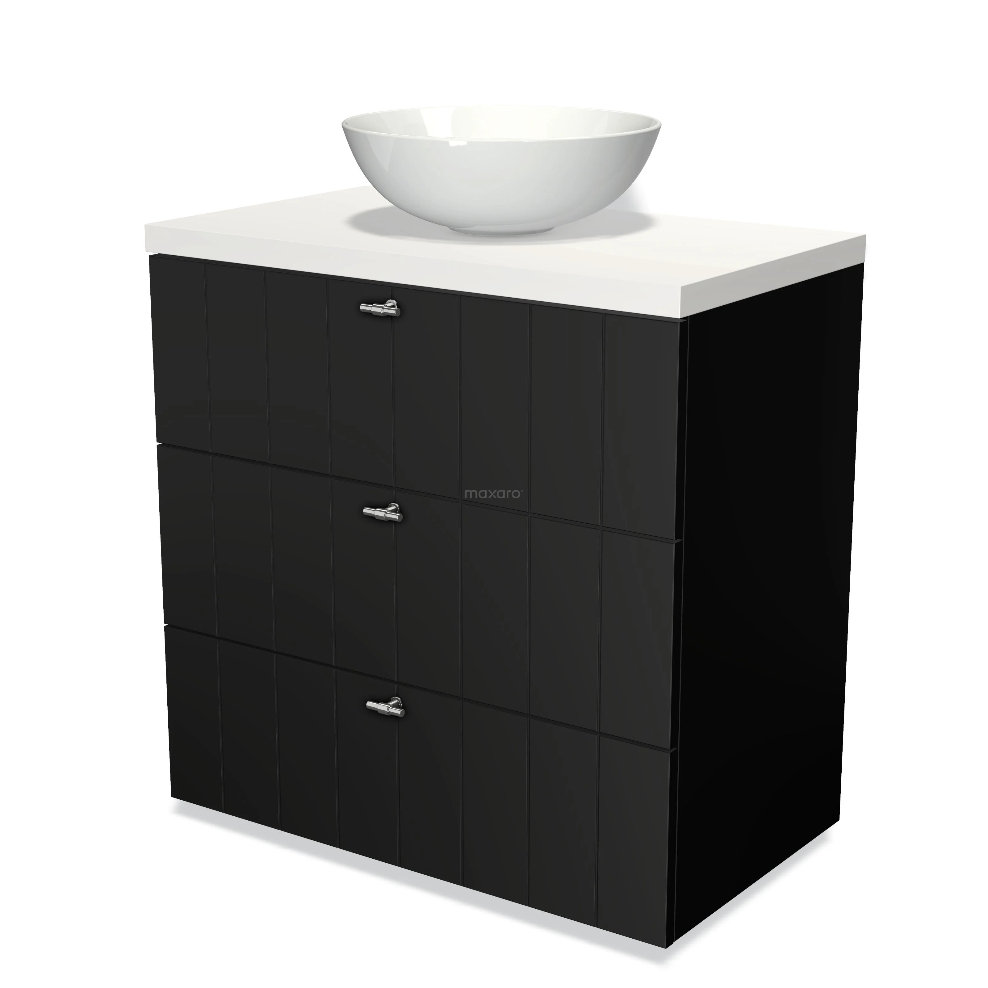Modulo Plato Badmöbel mit Aufsatzwaschbecken | 80 cm Matt Schwarz Lamelle front Matt Weiß blatt 3 Schubladen