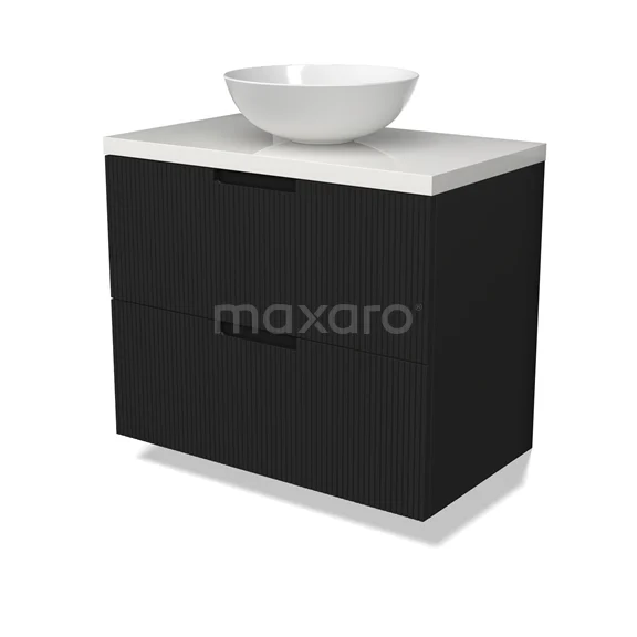 Modulo Plato Badmöbel mit Aufsatzwaschbecken | 80 cm Matt Schwarz Linie front Hochglanz Weiß blatt 2 übereinanderliegende Schubladen BMK17-03006