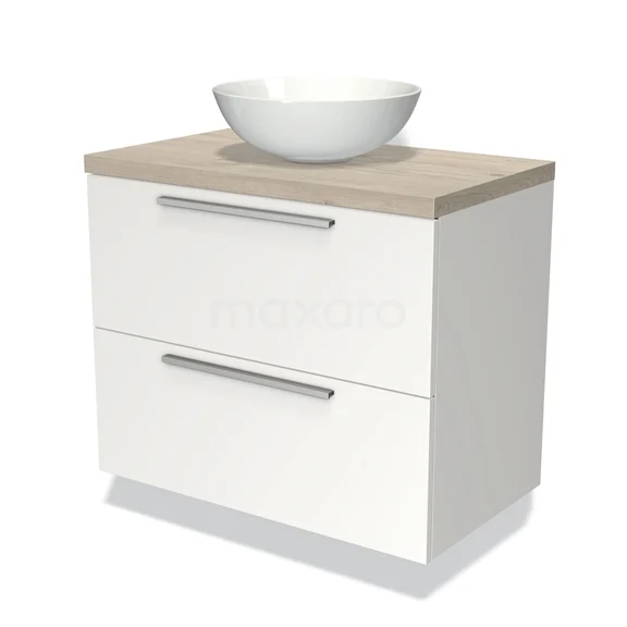 Modulo Plato Badmöbel mit Aufsatzwaschbecken | 80 cm Matt Weiß Flach front Hellgraue Eiche blatt 2 übereinanderliegende Schubladen