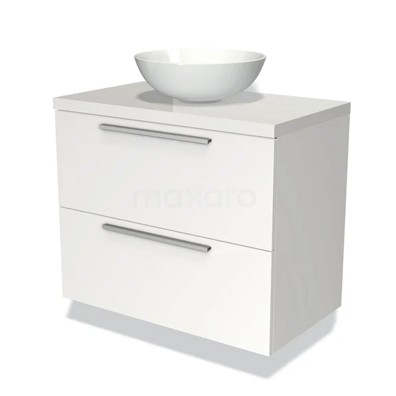 Modulo Plato Badmöbel mit Aufsatzwaschbecken | 80 cm Matt Weiß Flach front Hochglanz Weiß blatt 2 übereinanderliegende Schubladen