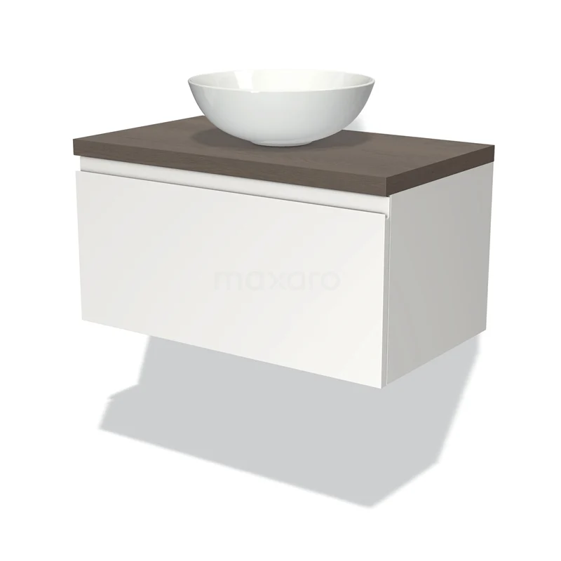 Modulo Plato Badmöbel mit Aufsatzwaschbecken | 80 cm Matt Weiß Grifflos front Dunkelbraune Eiche blatt 1 Schublade