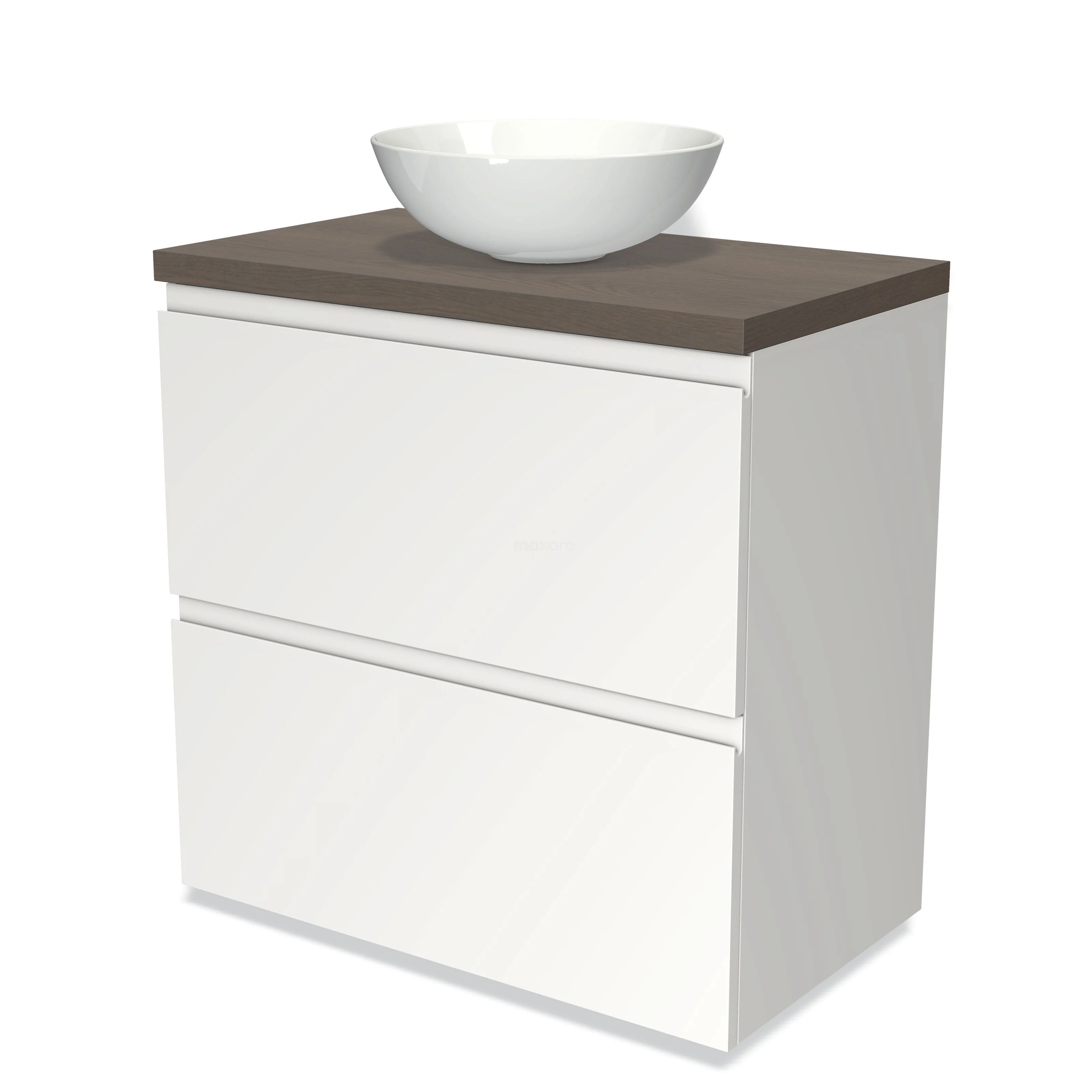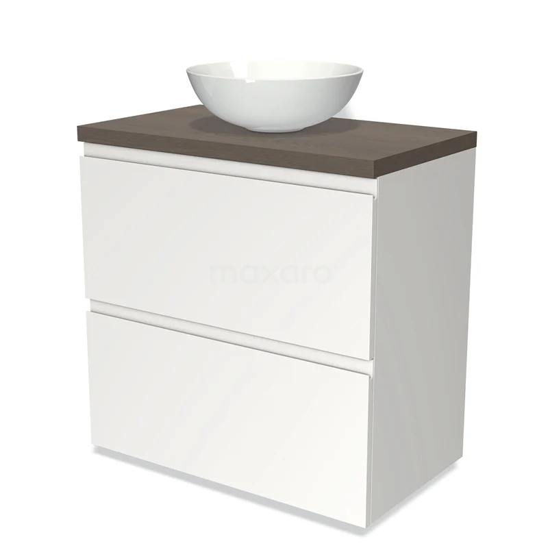 Modulo Plato Badmöbel mit Aufsatzwaschbecken | 80 cm Matt Weiß Grifflos front Dunkelbraune Eiche blatt 2 hohe Schubladen übereinanderliegend