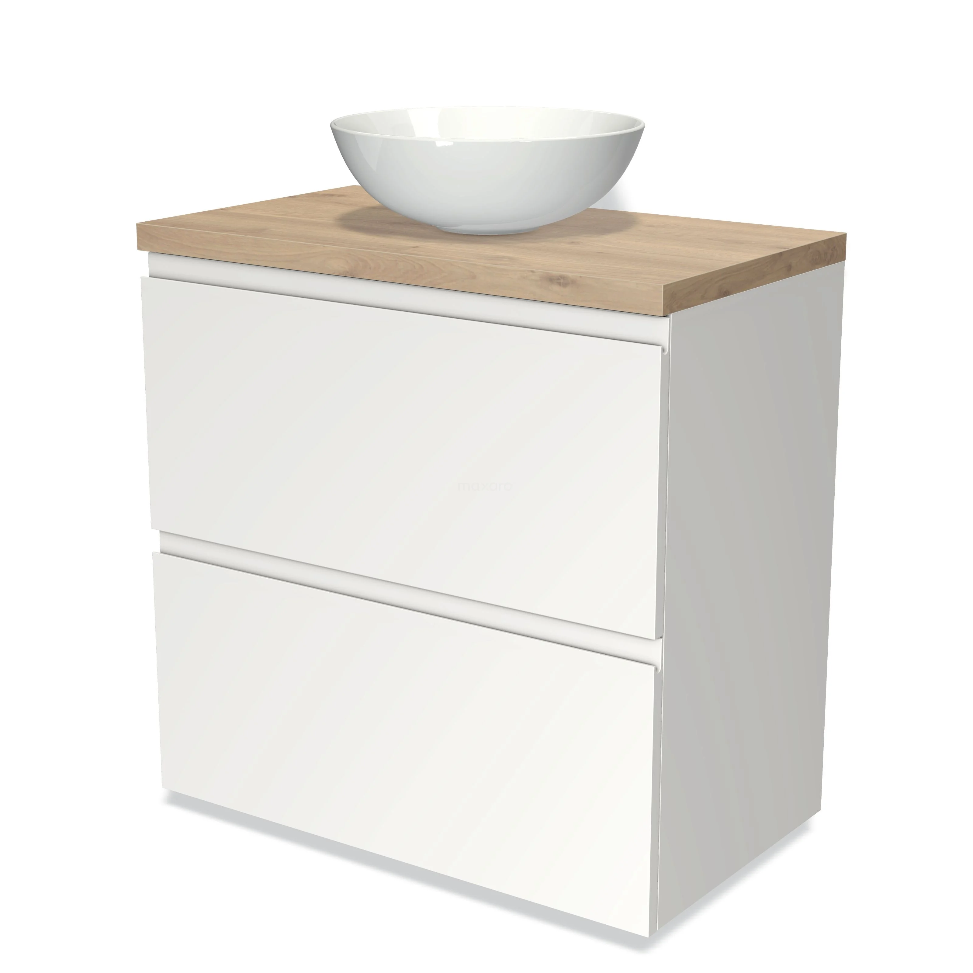 Modulo Plato Badmöbel mit Aufsatzwaschbecken | 80 cm Matt Weiß Grifflos front Hellbraune Eiche blatt 2 hohe Schubladen übereinanderliegend