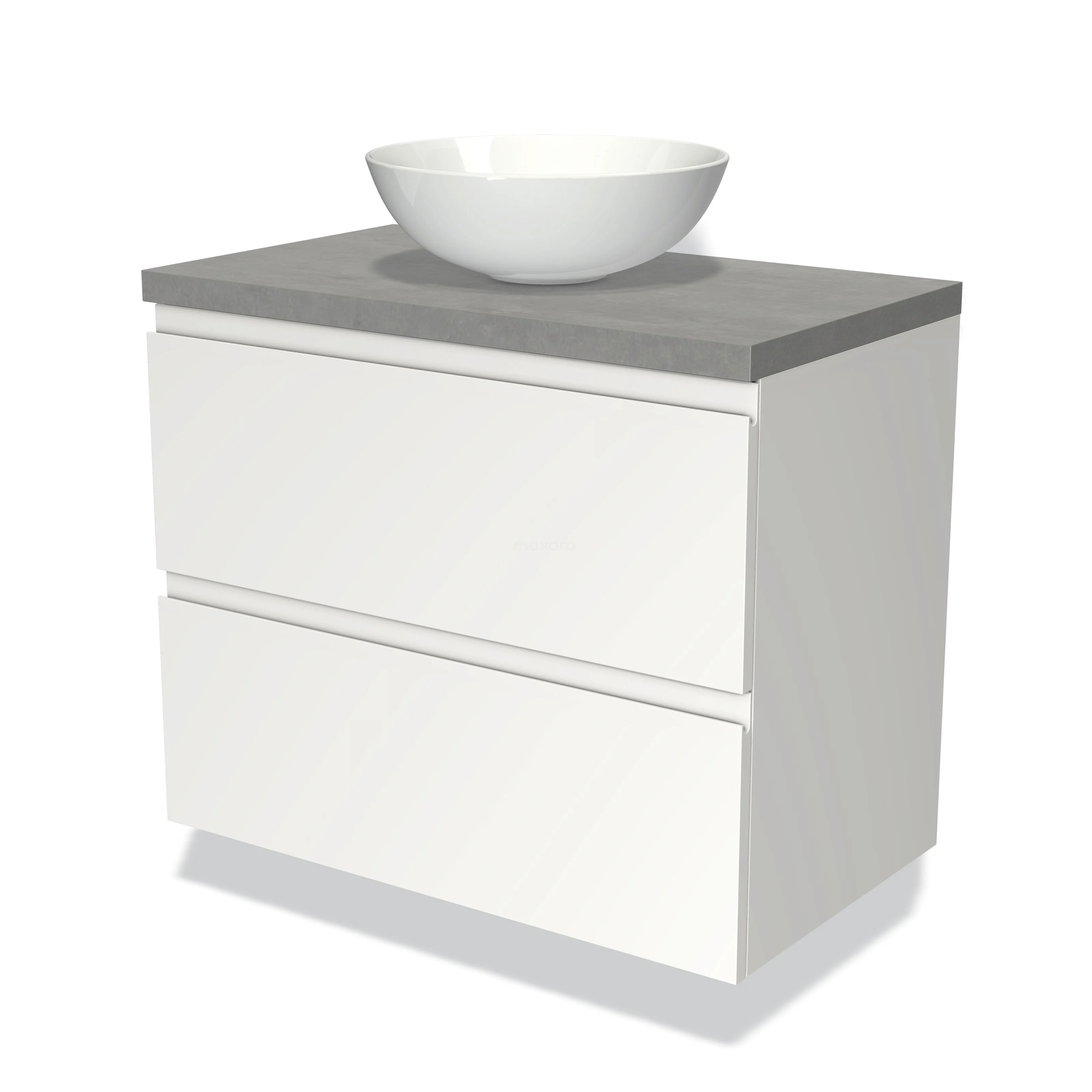 Modulo Plato Badmöbel mit Aufsatzwaschbecken | 80 cm Matt Weiß Grifflos front Hellgrauer Beton blatt 2 übereinanderliegende Schubladen