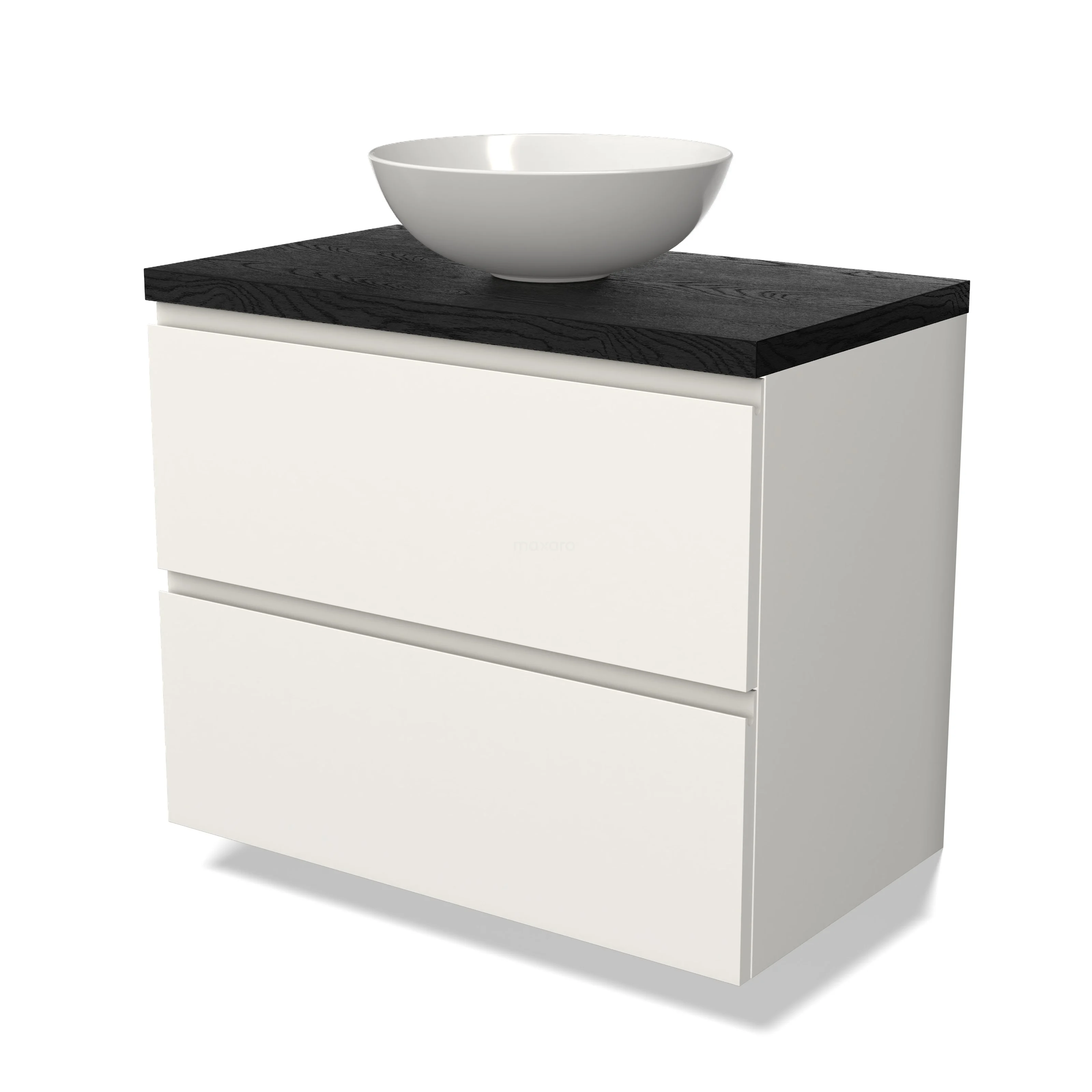 Modulo Plato Badmöbel mit Aufsatzwaschbecken | 80 cm Matt Weiß Grifflos front Schwarze Eiche blatt 2 übereinanderliegende Schubladen